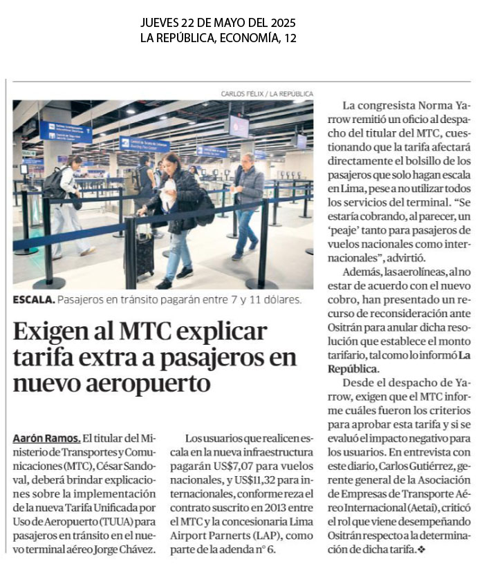El titular del Ministerio de Transportes y Comunicaciones (MTC), César Sandoval, deberá brindar explicaciones sobre la implementación de la nueva Tarifa Unificada por Uso de Aeropuerto (TUUA) para pasajeros en tránsito en el nuevo terminal aéreo Jorge Chávez. . La congresista Norma Yarrow remitió un oficio al despacho del titular del MTC, cuestionando que la tarifa —establecida mediante la Resolución N.º 041-2025-PD-Ositrán— afectará directamente el bolsillo de los pasajeros que solo hagan escala en Lima, al tener que pagar entre 7 y 11 dólares adicionales, pese a no utilizar todos los servicios del terminal.