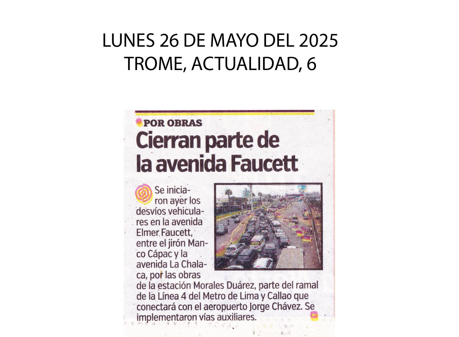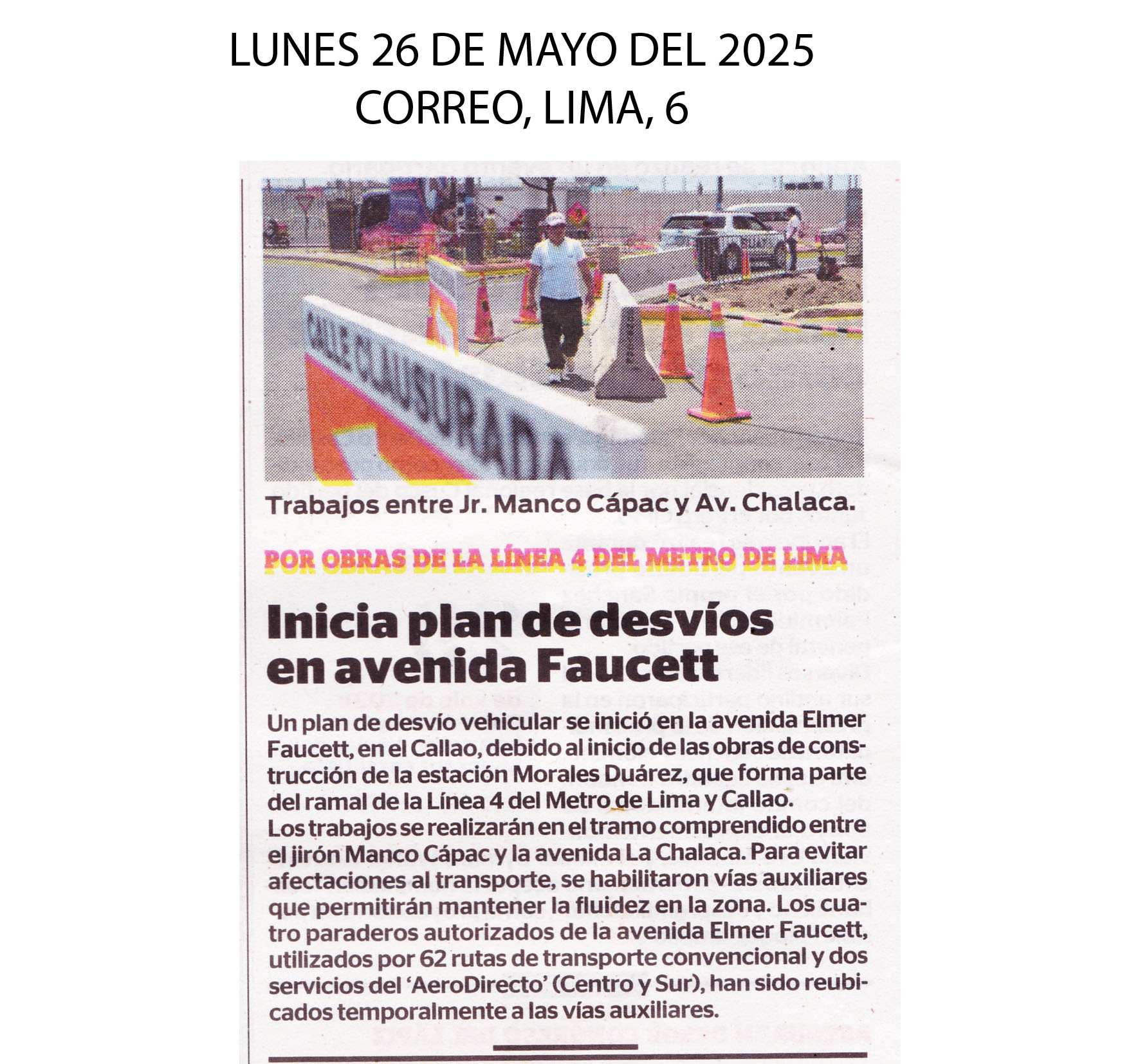 Un plan de desvío vehicular se inició en la avenida Elmer Faucett, en el Callao, debido al inicio de las obras de construcción de la estación Morales Duárez, que forma parte del ramal de la Línea 4 del Metro de Lima y Callao. Los trabajos se realizarán en el tramo comprendido entre el jirón Manco Cápac y la avenida La Chalaca. Para evitar afectaciones al trasporte, se habilitaron vías auxiliares que permitirán mantener la fluidez en la zona.