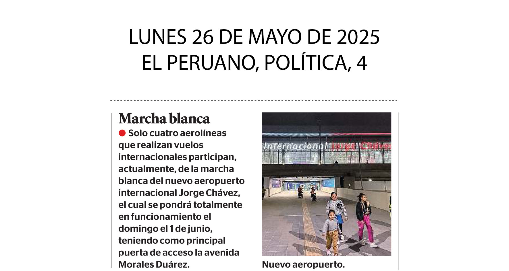 Solo cuatro aerolíneas que realizan vuelos internacionales participan, actualmente, de la marcha blanca del nuevo aeropuerto internacional Jorge Chávez, el cual se pondrá totalmente en funcionamiento el domingo el 1 de junio, teniendo como principal puerta de acceso la avenida Morales Duárez.