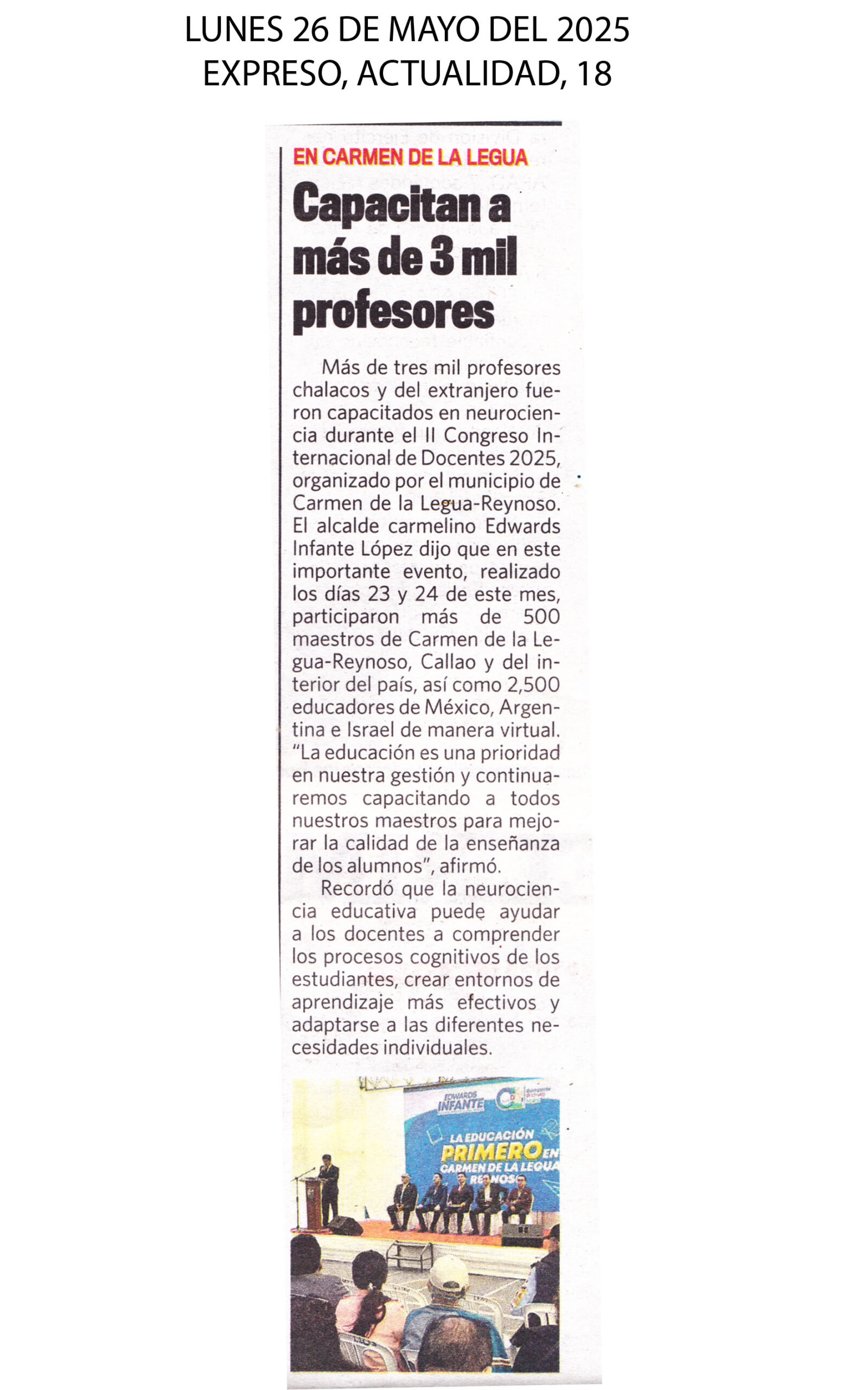 Más de tres mil profesores chalacos y del extranjero fueron capacitados en neurociencia durante el II Congreso Internacional de Docentes 2025, organizado por el municipio de Carmen de la Legua-Reynoso. El alcalde carmelino Edwards Infante López dijo que en este importante evento, realizado los días 23 y 24 de este mes, participaron más de 500 maestros de Carmen de la Legua-Reynoso, Callao y del interior del país, así como 2,500 educadores de México, Argentina e Israel de manera virtual.