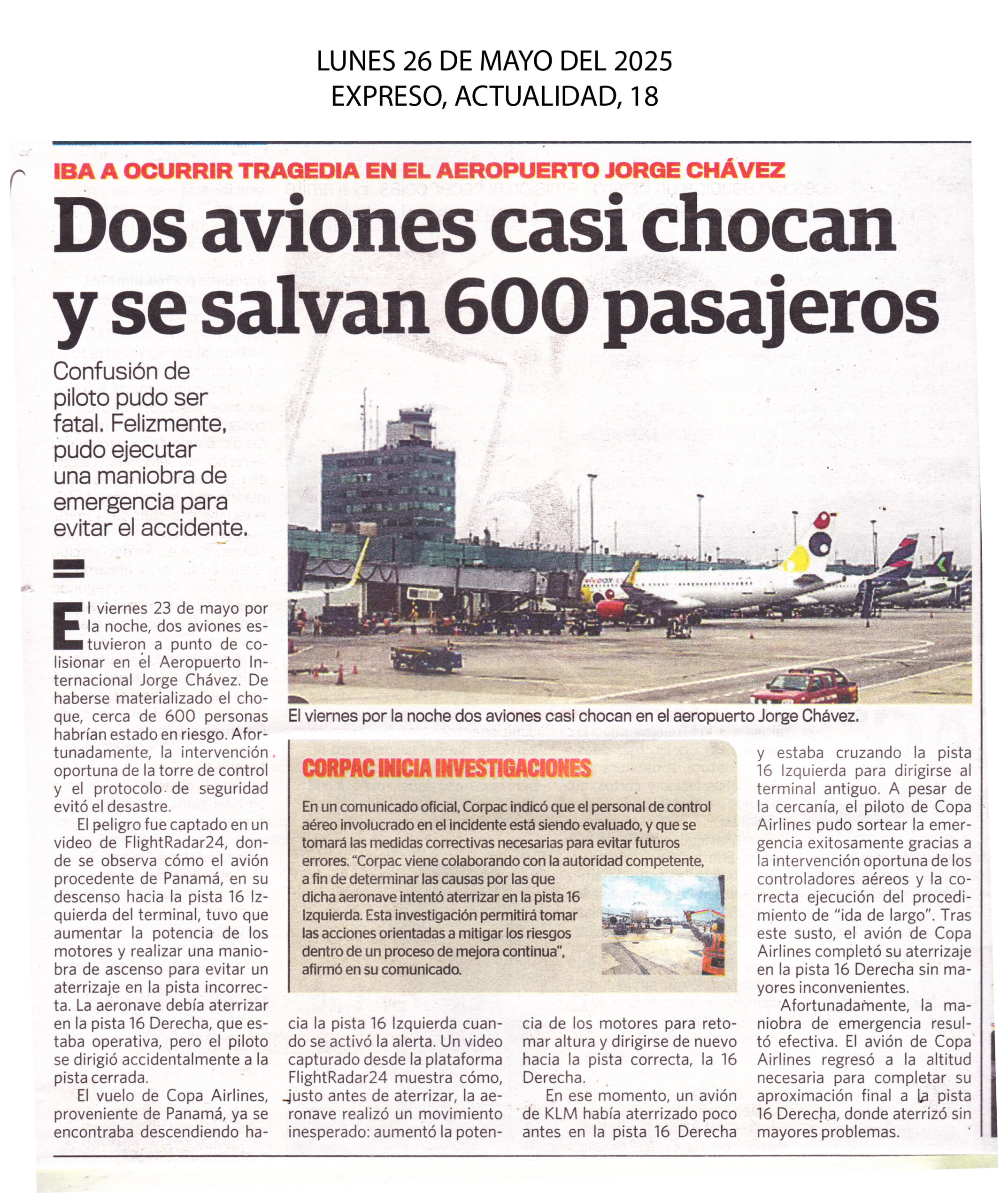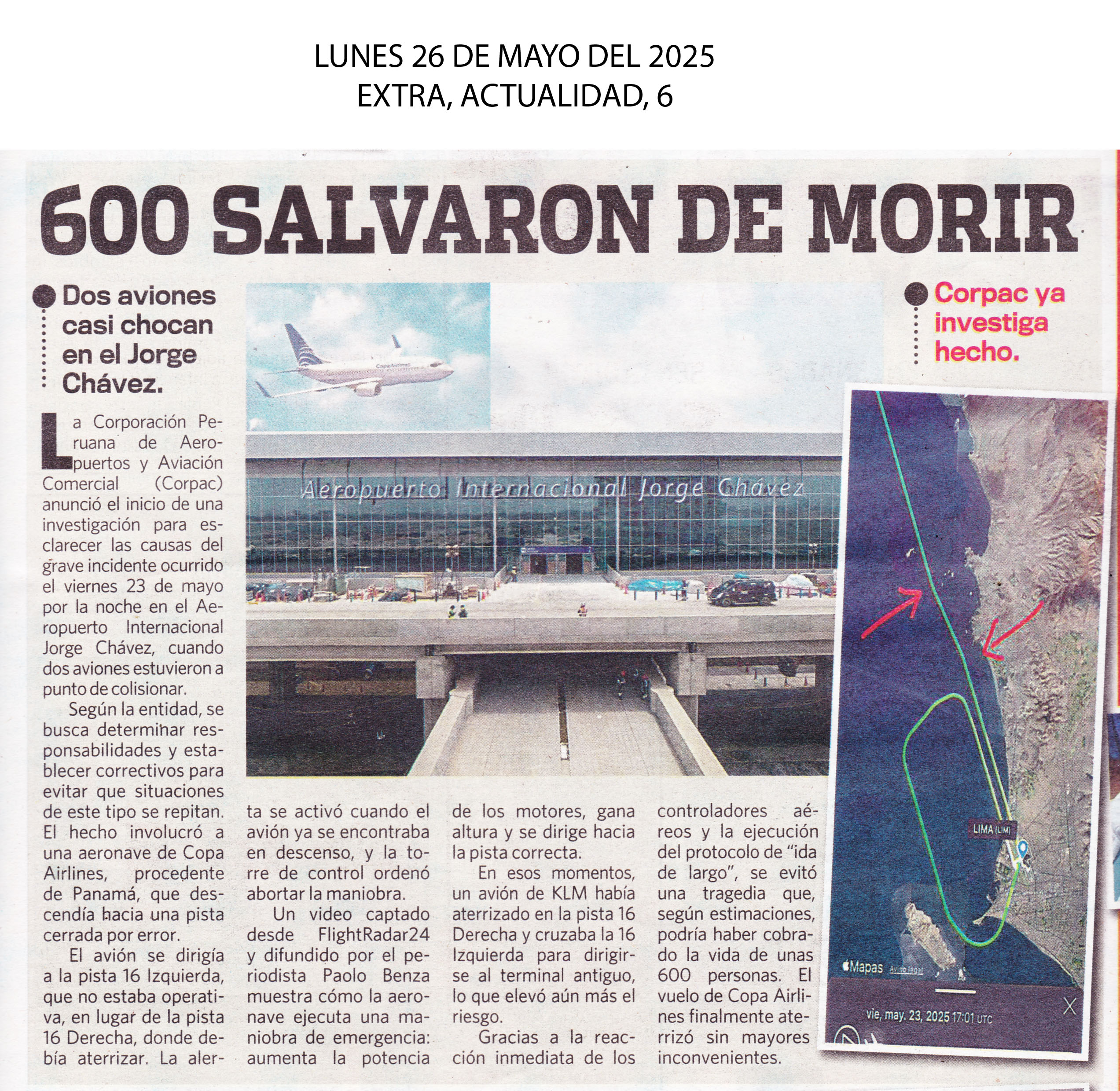 El viernes 23 de mayo por la noche, dos aviones estuvieron a punto de colisionar en el Aeropuerto Internacional Jorge Chávez. De haberse materializado el choque, cerca de 600 personas habrían estado en riesgo. Afortunadamente, la intervención oportuna de la torre de control y el protocolo de seguridad evitó el desastre. El peligro fue captado en un video de FlightRadar24, donde se observa cómo el avión procedente de Panamá, en su descenso hacia la pista 16 Izquierda del terminal aéreo peruano, tuvo que aumentar la potencia de los motores y realizar una maniobra de ascenso para evitar un aterrizaje en la pista incorrecta. La aeronave debía aterrizar en la pista 16 Derecha, que estaba operativa, pero el piloto se dirigió accidentalmente a la pista cerrada. La Corporación Peruana de Aeropuertos y Aviación Comercial (Corpac), la entidad encargada de la gestión del tránsito aéreo, confirmó mediante un comunicado que ya se inició una investigación para esclarecer las causas del error y garantizar que este tipo de situaciones no se repitan.