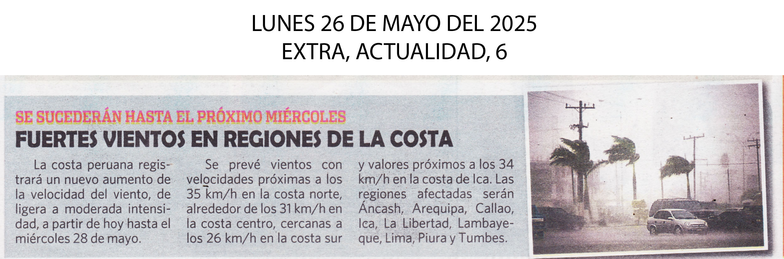 La costa peruana registrar un nuevo aumento de la velocidad del viento, de ligera a moderada intensidad, a partir de hoy hasta el miércoles 28 de mayo. Se prevé vientos con velocidades próximas a los 35 km/h en la costa norte, alrededor de los 31 km/h en la costa centro, cercanas a los 26 km/h en la costa sur y valores próximos a los 34 km/h en la cosa de Ica. Las regiones afectadas serán Áncash, Arequipa, Callao, Ica, La Libertad, Lambayeque, Piura y Tumbes.