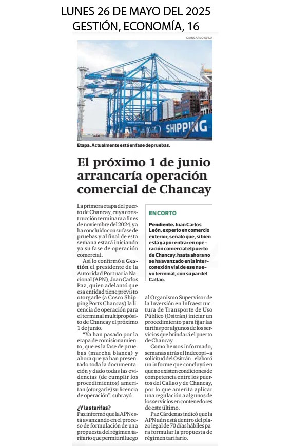 La primera etapa del puerto de Chancay, cuya construcción terminara a fines de noviembre del 2024, ya ha concluido su fase de pruebas y al final de esta semana, el 1 de junio, estará iniciando ya su fase de operación comercial. Juan Carlos Paz, presidente de la Autoridad Portuaria Nacional (APNO informó que su entidad está avanzando en proceso de formulación de una propuesta del régimen tarifario que permitirá luego al Ositrán iniciar un procedimiento para fijar las tarifas por algunos de lo servicios que brindará el puerto de Chancay. Semanas atrás el Indecopi elaboró un informe que concluyó que no existen condiciones de competencia entre los puertos del Callao y de Chancay por lo que amerita aplicar una regulación a algunos de los servicios de contenedores de este último.