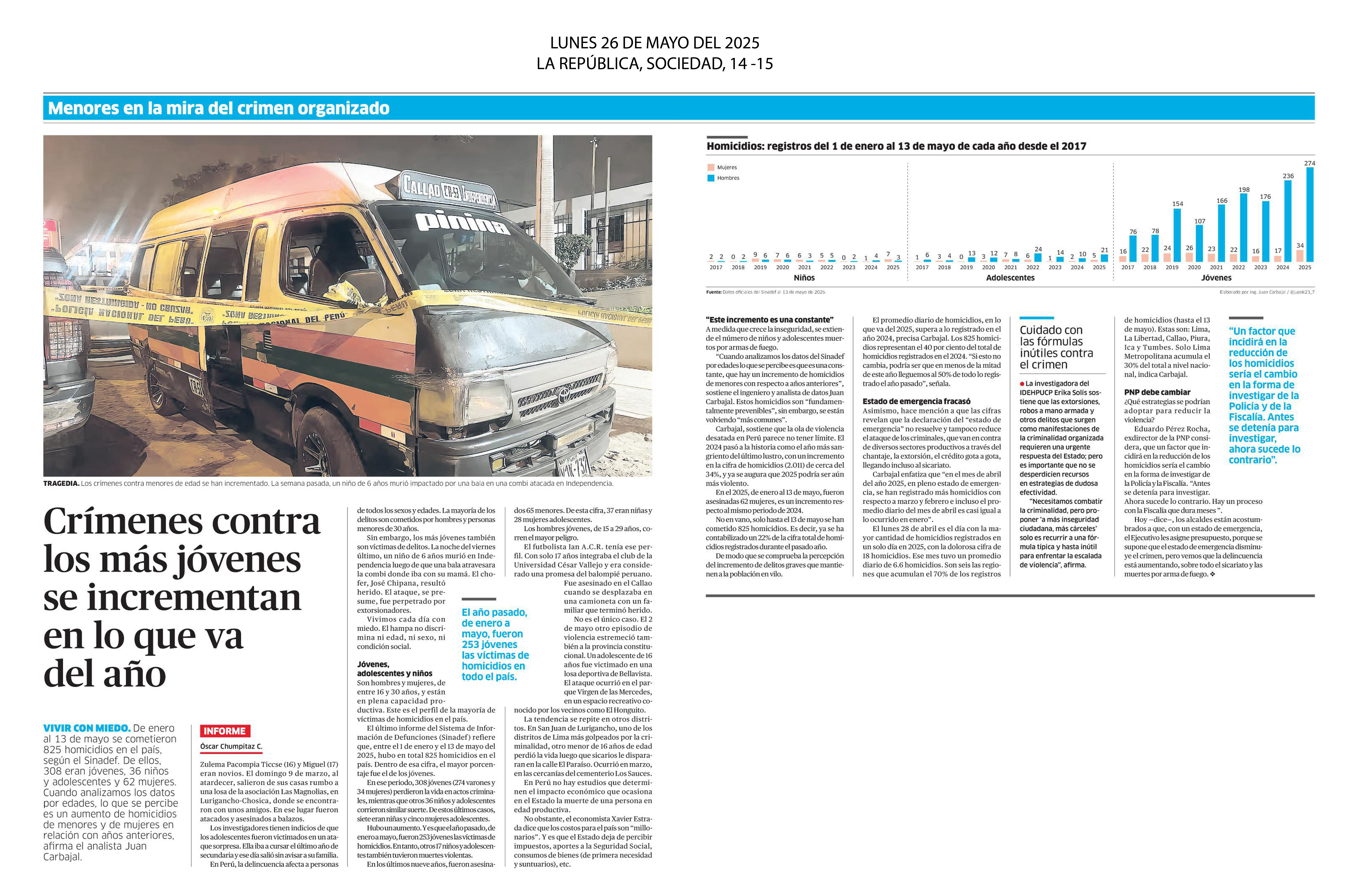 De enero al 13 de mayo se cometieron 825 homicidios en el país, según el Sinadef. De ellos, 308 era jóvenes, 36 miños y adolescentes y 62 mujeres. Cuando analizamos los datos por edades, lo que se percibe es un aumento de homicidios de menores y de mujeres en relación con años anteriores, afirma el analista Juan Carbajal. El mes de mayo tuvo un promedio diario de 6.6 homicidios. Son seis las regiones que acumulan el 70% de los registros de homicidios (hasta el 13 de mayo). Esta son: Lima, La Libertad, Callao, Piura, Ica y Tumbes.