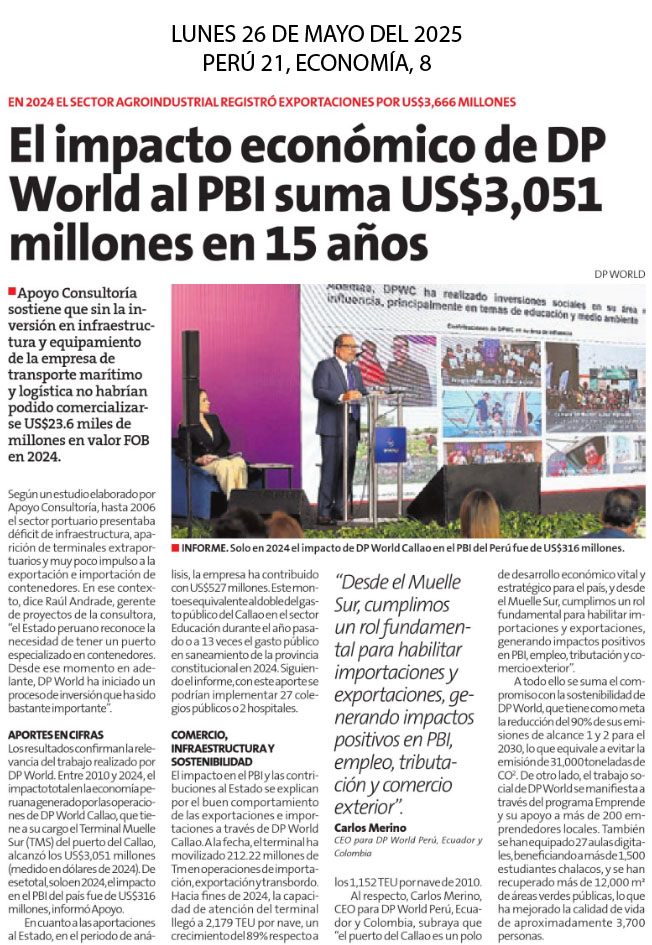 Según un estudio elaborado por Apoyo Consultoría, hasta 2006 el sector portuario presentaba déficit de infraestructura, aparición de terminales extraportuarios y muy poco impulso a la exportación e importación de contenedores. En ese contexto, dice Raúl Andrade, gerente de proyectos de la consultora, “el Estado peruano reconoce la necesidad de tener un puerto especializado en contenedores. Desde ese momento en adelante, DP World ha iniciado un proceso de inversión que ha sido bastante importante”. Los resultados confirman la relevancia del trabajo realizado por DP World. Entre 2010 y 2024, el impacto total en la economía peruana generado por las operaciones de DP World Callao, que tiene a su cargo el Terminal Muelle Sur (TMS) del puerto del Callao, alcanzó los US$3,051 millones (medido en dólares de 2024). De ese total, solo en 2024, el impacto en el PBI del país fue de US$316 millones, informó Apoyo.