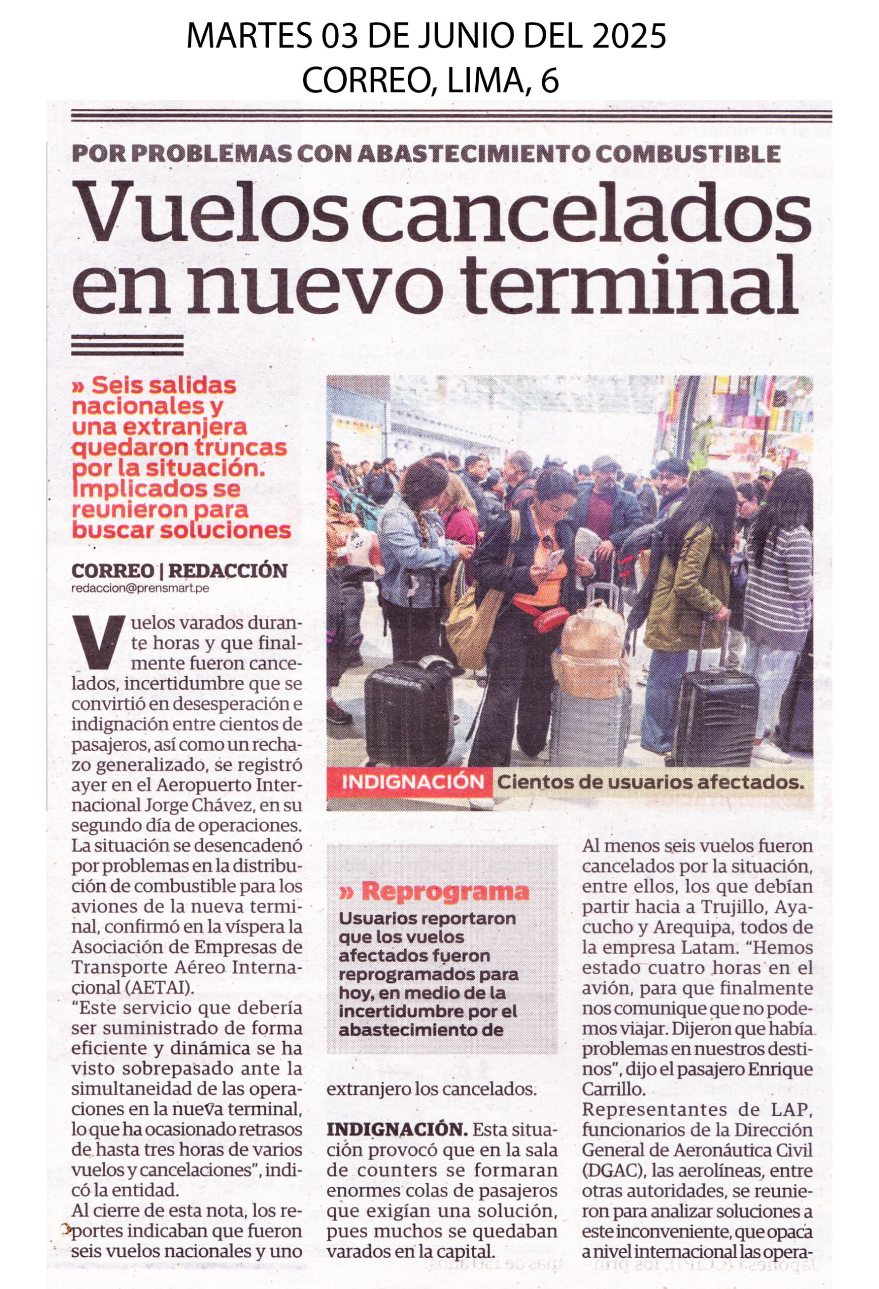 El Ministerio de Transportes y Comunicaciones (MTC) informó que trabaja con el concesionario del nuevo aeropuerto internacional Jorge Chávez, Lima Airport Partners, para resolver el problema de abastecimiento de combustible a las aeronaves, que ha obligado a cancelar algunos vuelos hacia provincias. Ayer, pasado el mediodía, numerosos pasajeros denunciaron que sus vuelos habían sido reprogramados o cancelados sin mayor explicación. Con el paso de las horas fueron informados que la razón del cambio se debía a un problema de falta de combustible para las aeronaves. Se cancelaron vuelos a Trujillo, Ayacucho y Arequipa, todos de la empresa Latam.