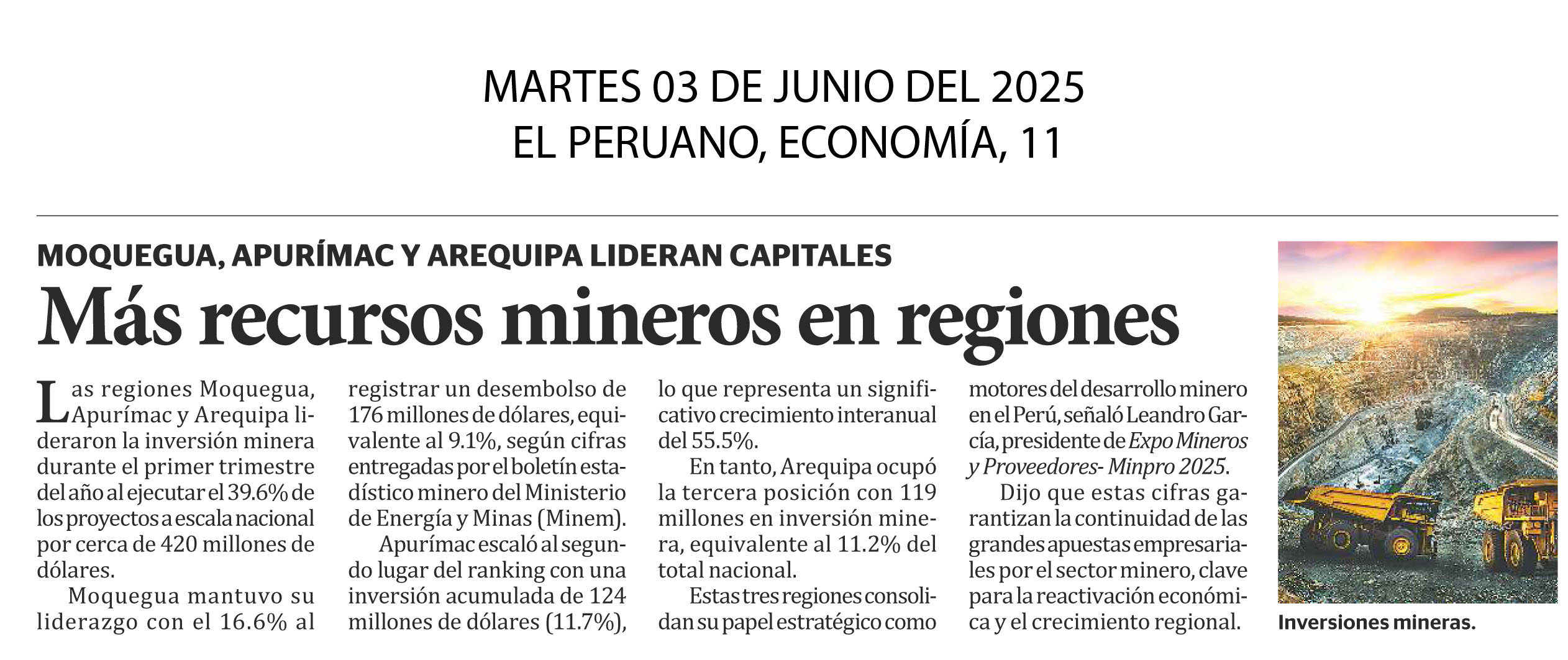 Las regiones Moquegua, Apurímac y Arequipa lideraron la inversión minera durante el primer trimestre del año al ejecutar el 39.6% de los proyectos a escala nacional por cerca de 420 millones de dólares. Moquegua mantuvo su liderazgo con el 16.6% al registrar un desembolso de 176 millones de dólares, equivalente al 9.1%, según cifras entregadas por el boletín estadístico minero del Ministerio de Energía y Minas (Minem). Apurímac escaló al segundo lugar del ranking con una inversión acumulada de 124 millones de dólares (11.7%) lo que representa un significativo crecimiento interanual del 55.5%. En tanto, Arequipa ocupó la tercera posición con 119 millones en inversión minera, equivalente al 11.2% del total nacional.