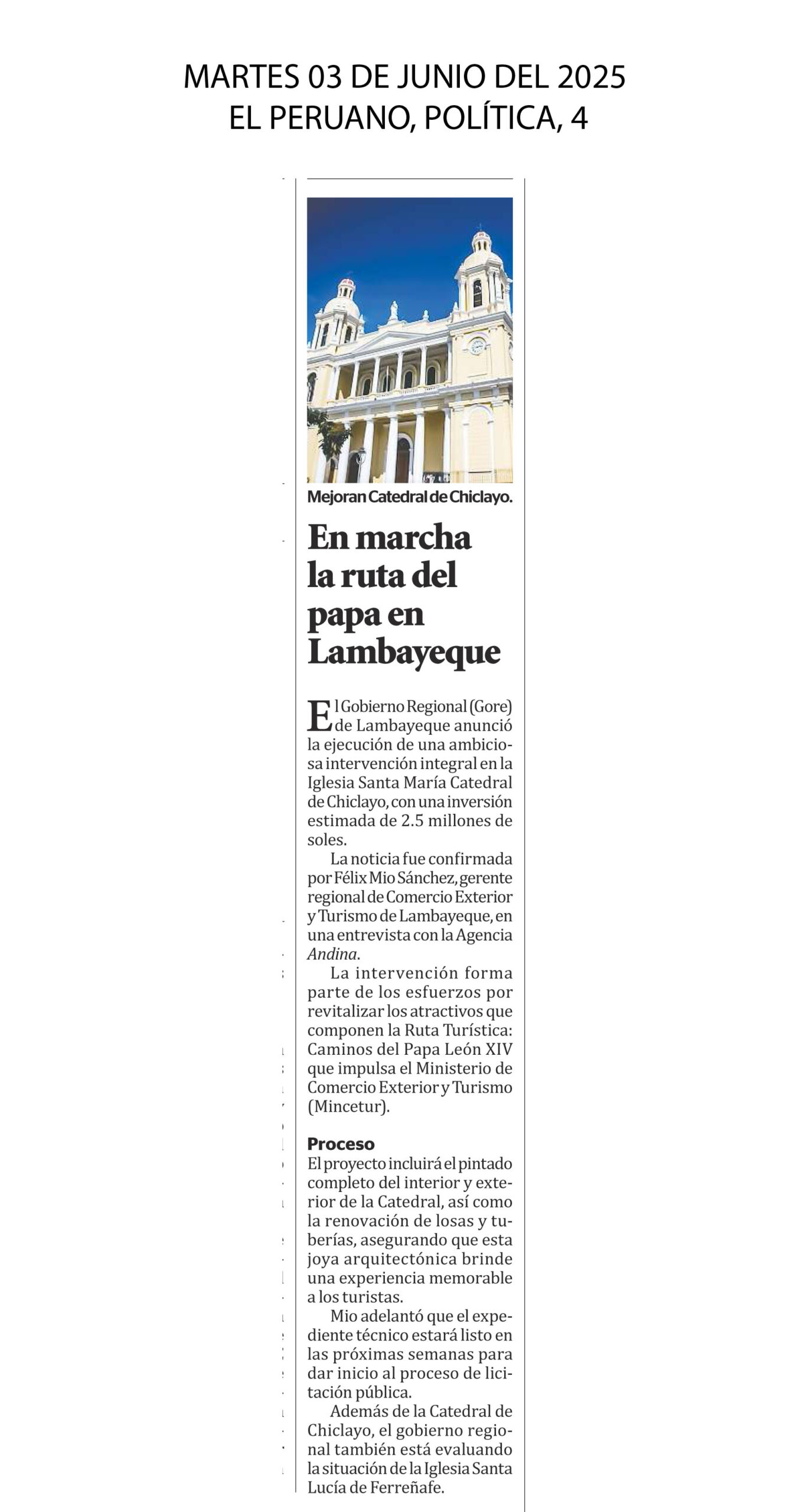 El Gobierno Regional (Gore) de Lambayeque anunció la ejecución de una ambiciosa intervención integral en la Iglesia Santa María Catedral de Chiclayo, con una inversión estimada de 2.5 millones de soles. La noticia fue confirmada por Félix Mio Sánchez, gerente regional de Comercio Exterior y Turismo de Lambayeque, en una entrevista con la Agencia Andina. La intervención forma parte de los esfuerzos por revitalizar los atractivos que componen la Ruta Turística: Caminos del Papa León XIV que impulsa el Ministerio de Comercio Exterior y Turismo (Mincetur).