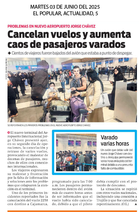 Tras solo dos días de su inauguración, el nuevo aeropuerto Jorge Chávez present problemas de suministro de combustible para algunos aviones, lo que afectó sus operaciones y generó grandes demoras. Esta situación perjudicó a decenas de pasajeros que sufrieron la repentina cancelación o el retraso de sus vuelos programados con anterioridad. "En el avión nos hicieron esperar 1 hora más hasta que cargue el combustible. Nos dijeron que no había proveedor que había fallado. Teníamos que esperar a que trajeran combustible y cuando se podía volar, el piloto ya no lo podía hacer porque habían pasado más de 11 horas de vuelo", dijeron a La República. Frente a este panorama, se recogió la versión de Rocío Espinoza, gerente de Comunicaciones de Lima Airport Partners (LAP), compañía encargada de la concesión del nuevo aeropuerto. La vocera precisó que la situación no responde a una escasez de combustible, sino a inconvenientes en su distribución.