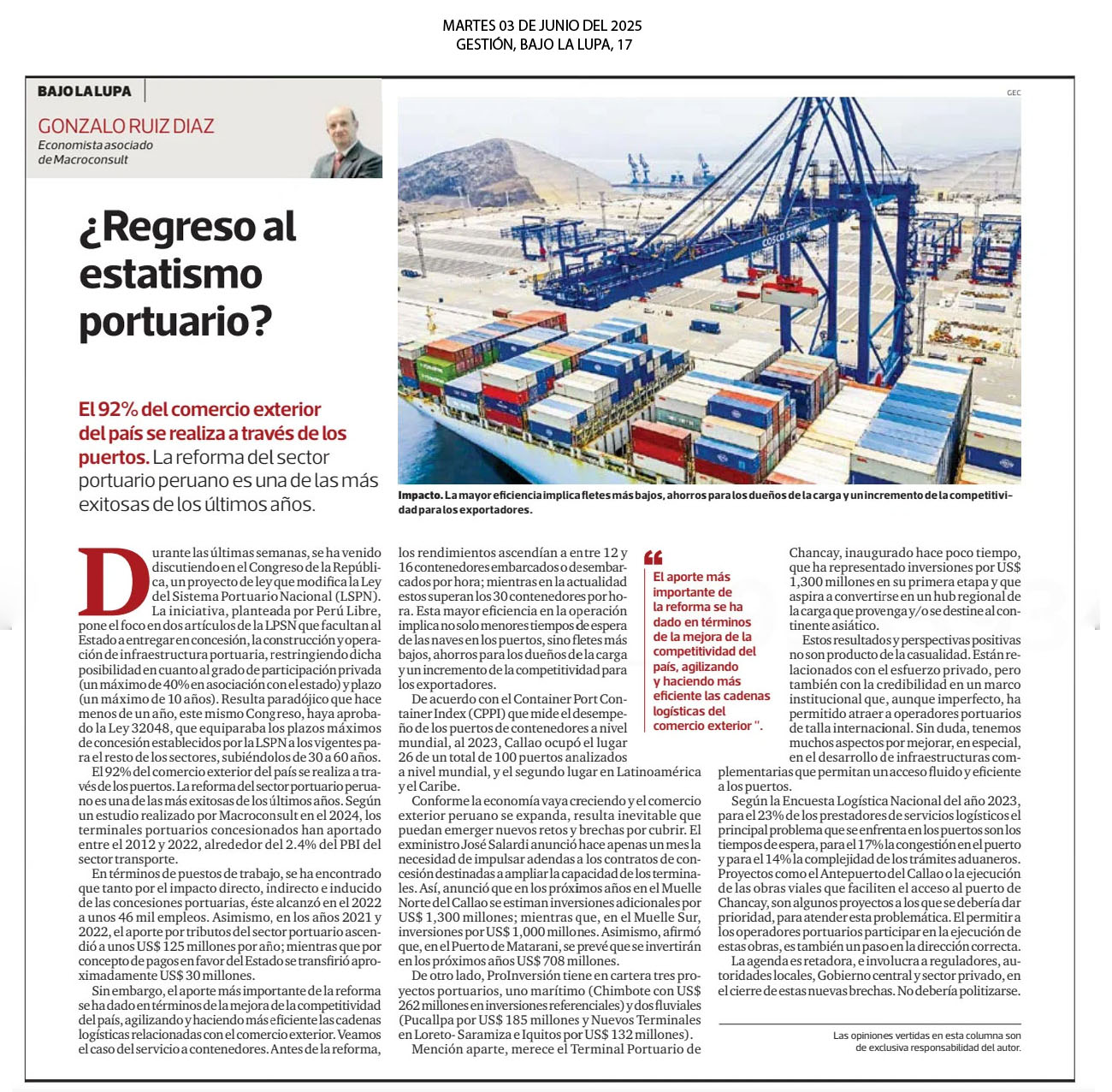 Artículo escrito por Gonzalo Ruiz Díaz (Economista asociado de Macroconsult). “(…) De acuerdo con el Container Port Container Index (CPPI) que mide el desempeño de los puertos de contenedores a nivel mundial, al 2023, Callao ocupó el lugar 26 de un total de 100 puertos analizados a nivel mundial, y el segundo lugar en Latinoamérica y el Caribe. Conforme la economía vaya creciendo y el comercio exterior peruano se expanda, resulta inevitable que puedan emerger nuevos retos y brechas por cubrir. El exministro José Salardi anunció hace apenas un mes la necesidad de impulsar adendas a los contratos de concesión destinadas a ampliar la capacidad de los terminales. Así, anunció que en los próximos años en el Muelle Norte del Callao se estiman inversiones adicionales por US$ 1,300 millones; mientras que en el Muelle Sur, inversiones por US$ 1,000 millones…”.