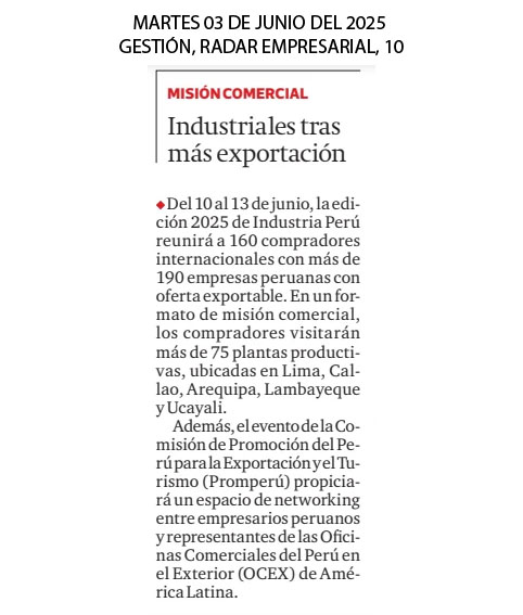 Del 10 al 13 de junio, la edición 2025 de Industria Perú reunirá a 160 compradores internacionales con más de 190 empresas peruanas con oferta exportable. En formato de mission commercial, los compradores visitarán más de 75 plantas productivas, ubicadas en Lima, Callao, Arequipa, Lambayeque y Ucayali.