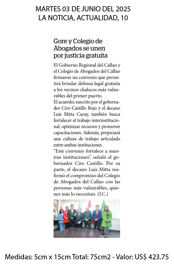El Gobierno Regional del Callao y el Colegio de Abogados del Callao firmaron un convenio que permitirá brindar defensa legal gratuita a los vecinos chalacos más vulnerables del primer puerto. El acuerdo, suscrito por el gobernador Ciro Castillo Rojo y el decano Luis Mitta Curay, también busca fortalecer el trabajo interinstitucional, optimizar recursos y promover capacitaciones. Además, propiciará una cultura de trabajo articulado entre ambas instituciones. “Este convenio fortalece a nuestras instituciones”, señaló el gobernador Ciro Castillo.