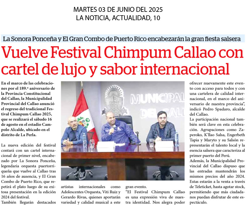 En el marco de las celebraciones por el 189.º aniversario de la Provincia Constitucional del Callao, la Municipalidad Provincial del Callao anunció el regreso del tradicional Festival Chimpum Callao 2025, que se realizará el sábado 16 de agosto en el estadio Campolo Alcalde, ubicado en el distrito de La Perla. La nueva edición del festival contará con un cartel internacional de primer nivel, encabezado por La Sonora Ponceña, legendaria orquesta puertorriqueña que vuelve al Callao tras 16 años de ausencia, y El Gran Combo de Puerto Rico, que repetirá el plato luego de su exitosa presentación en la edición 2024 del festival.