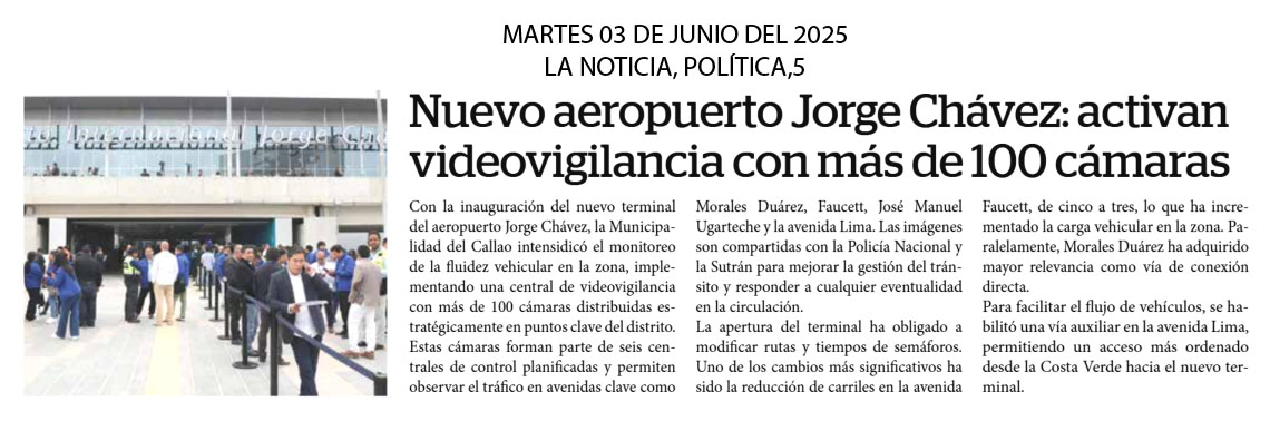 Con la inauguración del nuevo terminal del aeropuerto Jorge Chávez, la Municipalidad del Callao intensidicó el monitoreo de la fluidez vehicular en la zona, implementando una central de videovigilancia con más de 100 cámaras distribuidas estratégicamente en puntos clave del distrito.