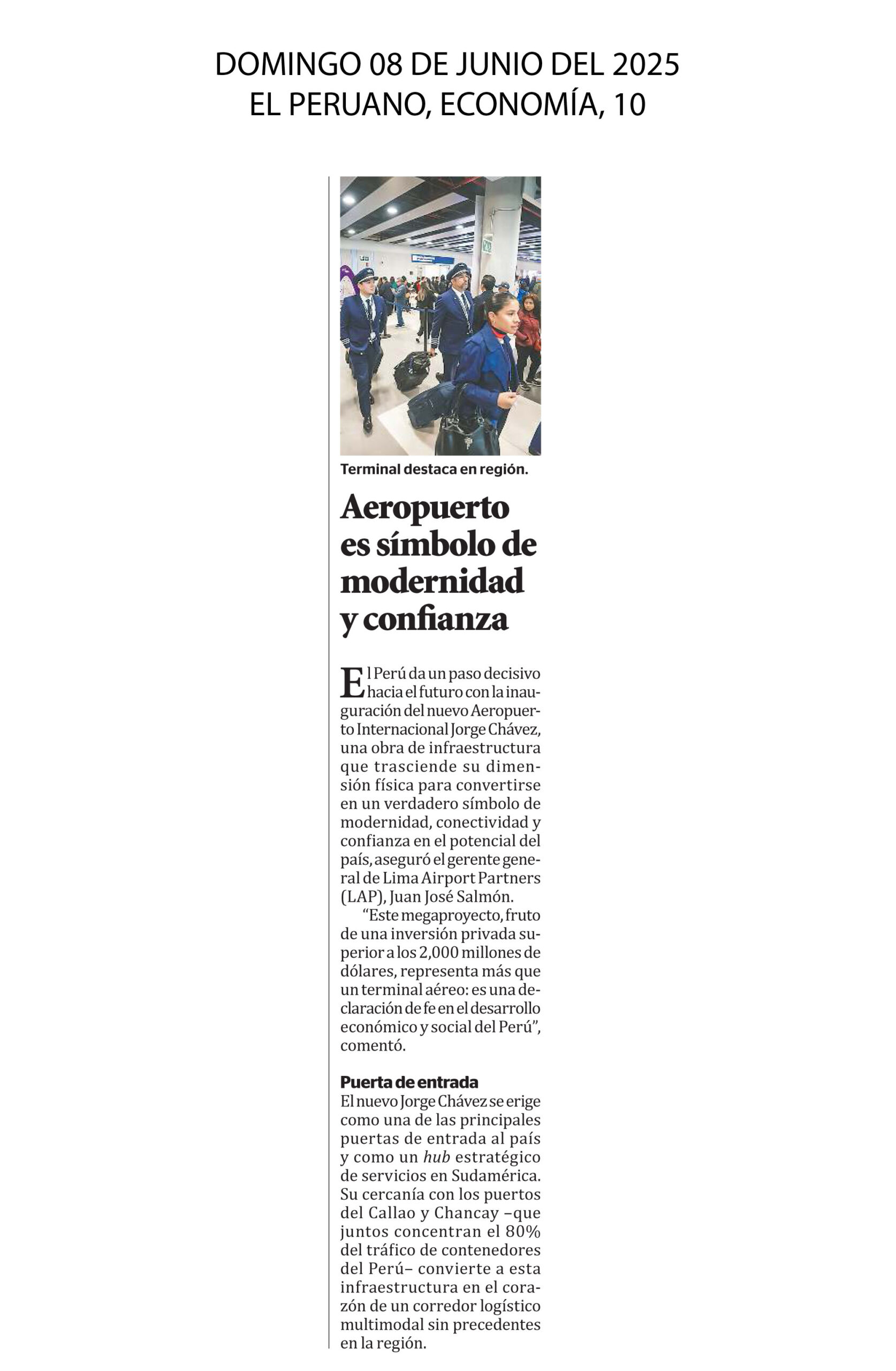 El Perú da un paso decisivo hacia el futuro con la inauguración del nuevo Aeropuerto Internacional Jorge Chávez, una obra de infraestructura que trasciende su dimensión física para convertirse en un verdadero símbolo de modernidad, conectividad y confianza en el potencial del país, aseguró el gerente general de Lima Airport Partners (LAP), Juan José Salmón. “Este megaproyecto, fruto de una inversión privada superior a los 2,000 millones de dólares, representa más que un terminal aéreo: es una declaración de fe en el desarrollo económico y social del Perú”, comentó. Su cercanía con los puertos del Callao y Chancay –que juntos concentran el 80% del tráfico de contenedores del Perú– convierte a esta infraestructura en el corazón de un corredor logístico multimodal sin precedentes en la región.