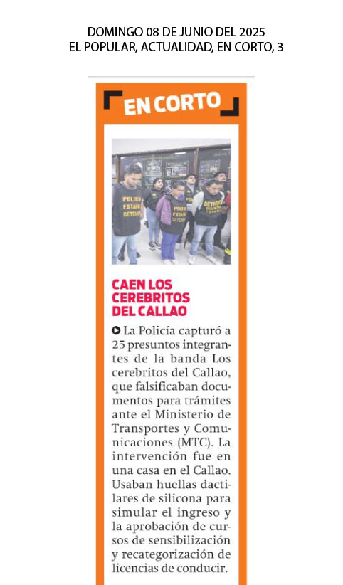 La Policía capture a 25 presuntos integrantes de la banda Los cerebritos del Callao, que falsificaban documentos para trámites ante el Ministerio de Transportes y Comunicaciones (MTC). La intervención fue en una casa del Callao.