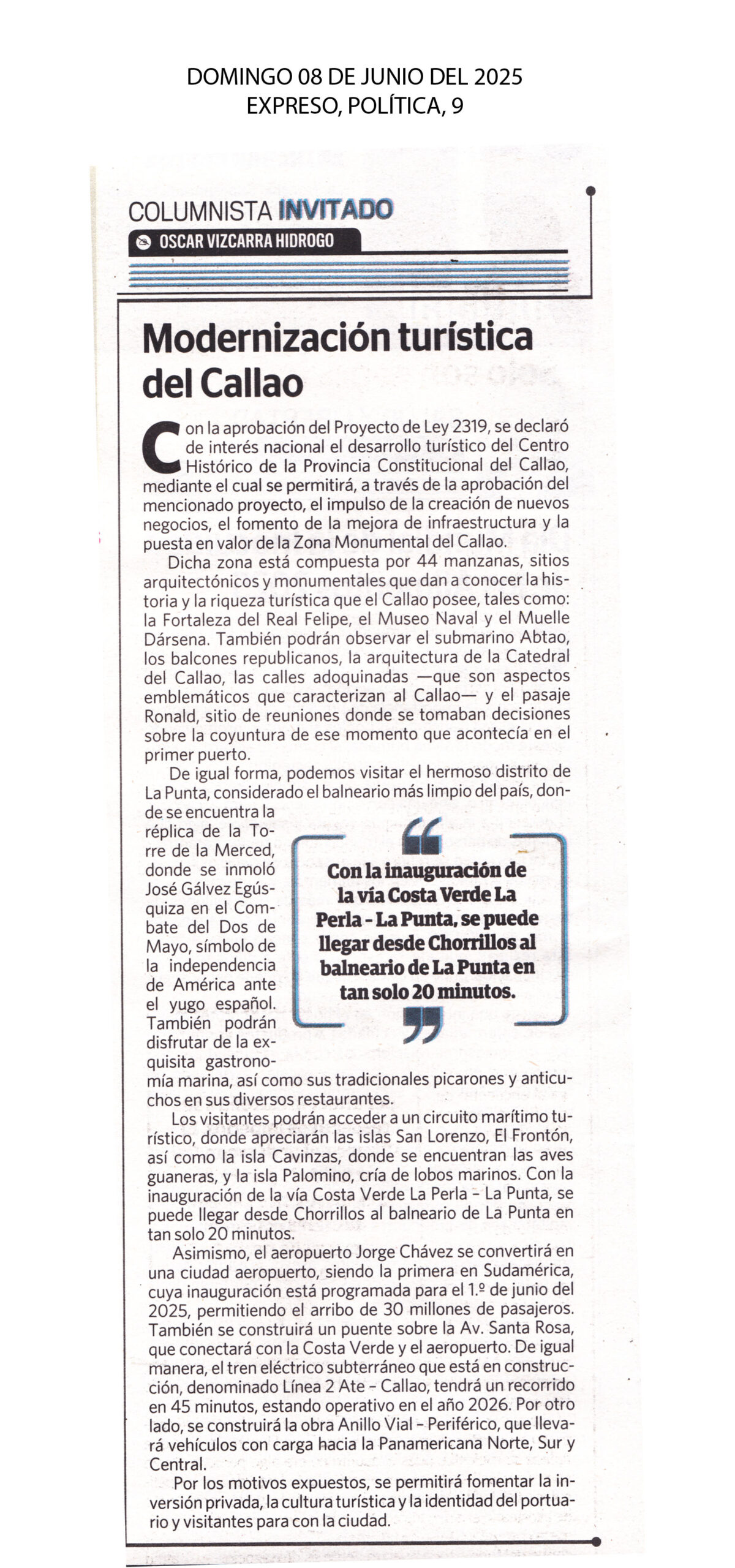 Artículo de Óscar Vizcarra Hidrogoa. "Con la aprobación del Proyecto de Ley 2319, se declaró de interés nacional el desarrollo turístico del Centro Histórico de la Provincia Constitucional del Callao, mediante el cual se permitirá, a través de la aprobación del mencionado proyecto, el impulso de la creación de nuevos negocios, el fomento de la mejora de infraestructura y la puesta en valor de la Zona Monumental del Callao. Dicha zona está compuesta por 44 manzanas, sitios arquitectónicos y monumentales que dan a conocer la historia y la riqueza turística que el Callao posee, tales como: la Fortaleza del Real Felipe, el Museo Naval y el Muelle Dársena. También podrán observar el submarino Abtao, los balcones republicanos, la arquitectura de la Catedral del Callao, las calles adoquinadas —que son aspectos emblemáticos que caracterizan al Callao— y el pasaje Ronald, sitio de reuniones donde se tomaban decisiones sobre la coyuntura de ese momento que acontecía en el primer puerto....".