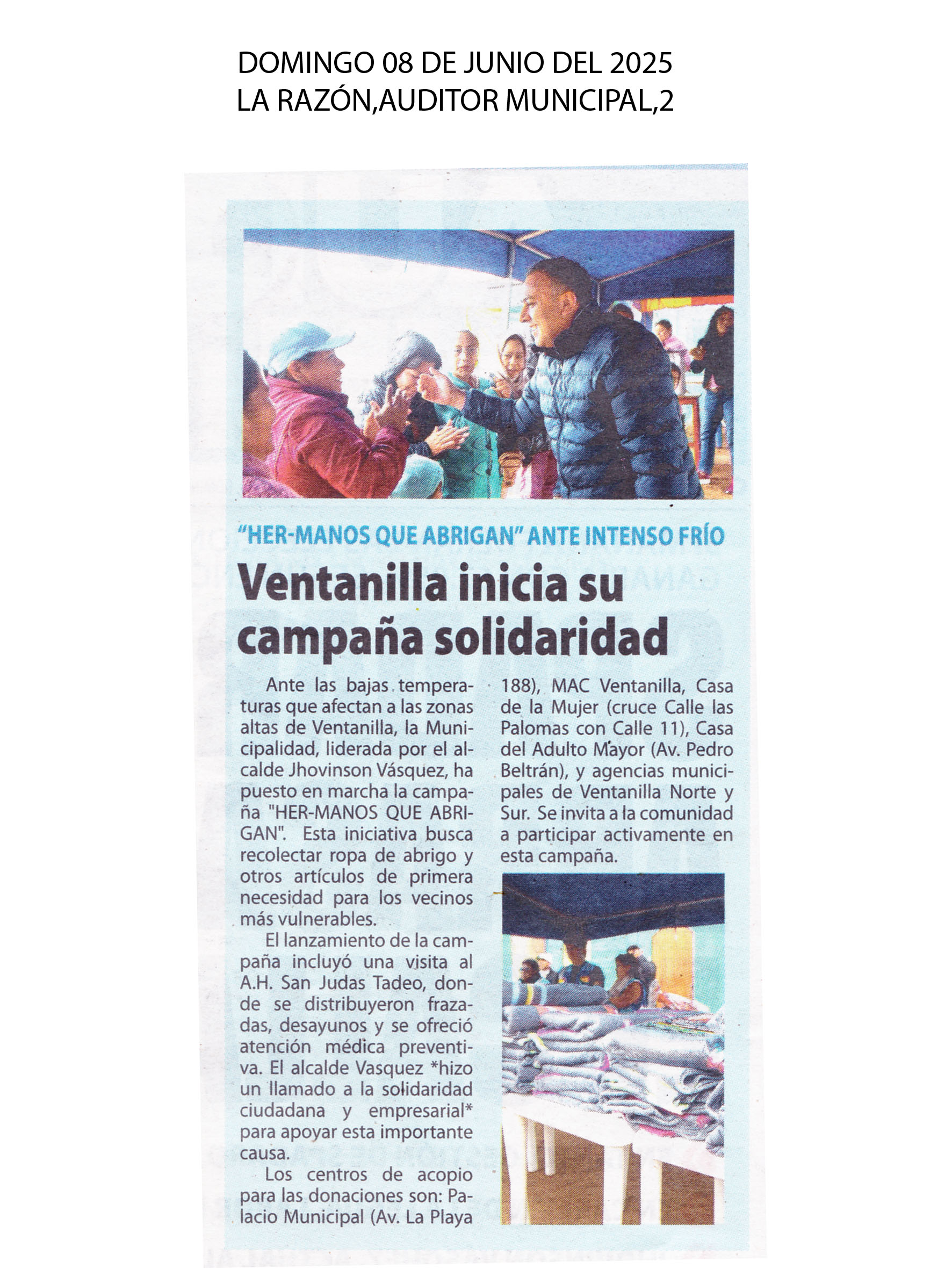 Ante las bajas temperaturas que afectan a las zonas alta de Ventanilla, la Municipalidad inició la campaña “HER-MANOS QUE ABRIGAN”, con el fin de recolectar ropa y abrigo en favor de los más vulnerables. Llegaremos a las zonas más altas del distrito con ayuda solidaria.