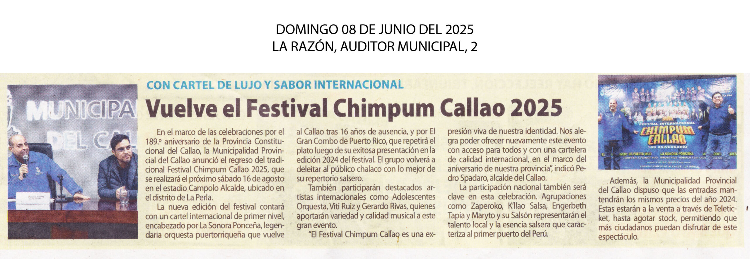 En el marco de las celebraciones por el 189.º aniversario de la Provincia Constitucional del Callao, la Municipalidad Provincial del Callao anunció el regreso del tradicional Festival Chimpum Callao 2025, que se realizará el próximo sábado 16 de agosto en el estadio Campolo Alcalde, ubicado en el distrito de La Perla.