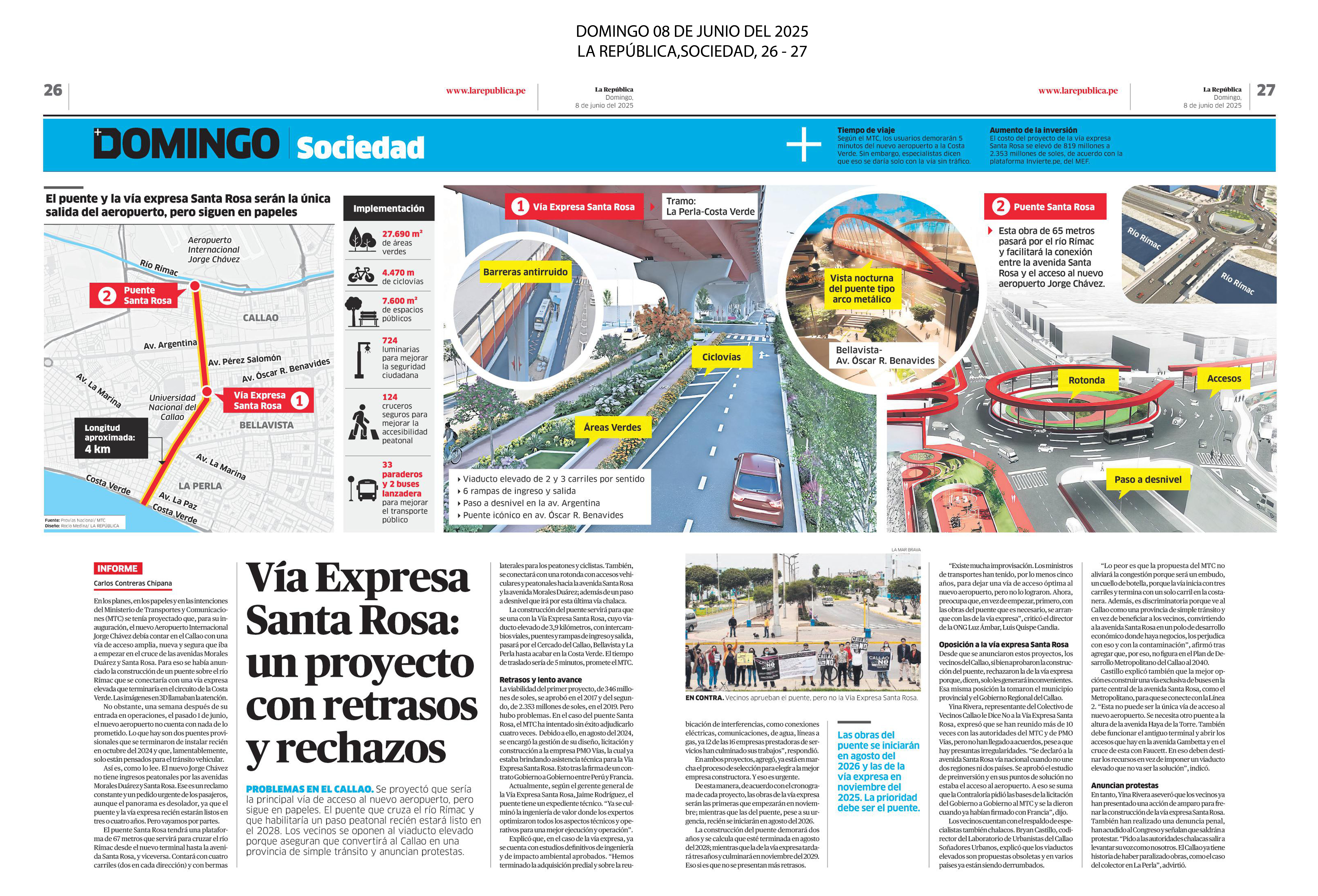 En los planes, en los papeles y en las intenciones del Ministerio de Transportes y Comunicaciones (MTC) se tenía proyectado que, para su inauguración, el nuevo Aeropuerto Internacional Jorge Chávez debía contar en el Callao con una vía de acceso amplia, nueva y segura que iba a empezar en el cruce de las avenidas Morales Duárez y Santa Rosa. Para eso se había anunciado la construcción de un puente sobre el río Rímac que se conectaría con una vía expresa elevada que terminaría en el circuito de la Costa Verde. Las imágenes en 3D llamaban la atención. No obstante, una semana después de su entrada en operaciones, el pasado 1 de junio, el nuevo aeropuerto no cuenta con nada de lo prometido. El panorama es desolador, ya que La República ha podido conocer que el puente y la vía expresa recién estarán listos en tres y cuatro años respectivamente.