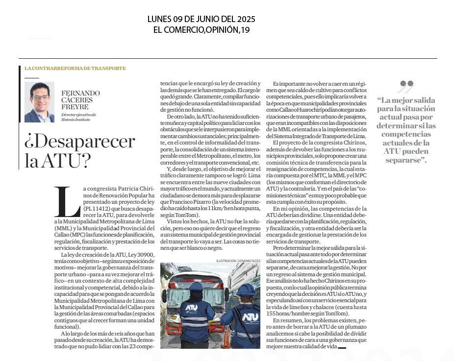 Artículo de Fernando Cáceres (Director ejecutivo de Síntesis Instituto). “La congresista Patricia Chirinos de Renovación Popular ha presentado un proyecto de ley (PL 11412) que busca desaparecer la ATU, para devolverle a la Municipalidad Metropolitana de Lima (MML) y la Municipalidad Provincial del Callao (MPC) las funciones de planificación, regulación, fiscalización y prestación de los servicios de transporte (…) En mi opinión, las competencias de la ATU deberían dividirse. Una entidad debería quedarse con la planificación, regulación, y fiscalización, y otra entidad debería ser la encargada de gestionar la prestación de los servicios de transporte. Pero determinar la mejor salida para la situación actual pasa ante todo por determinar si las competencias actuales de la ATU pueden separarse, de cara a mejorar la gestión…”.