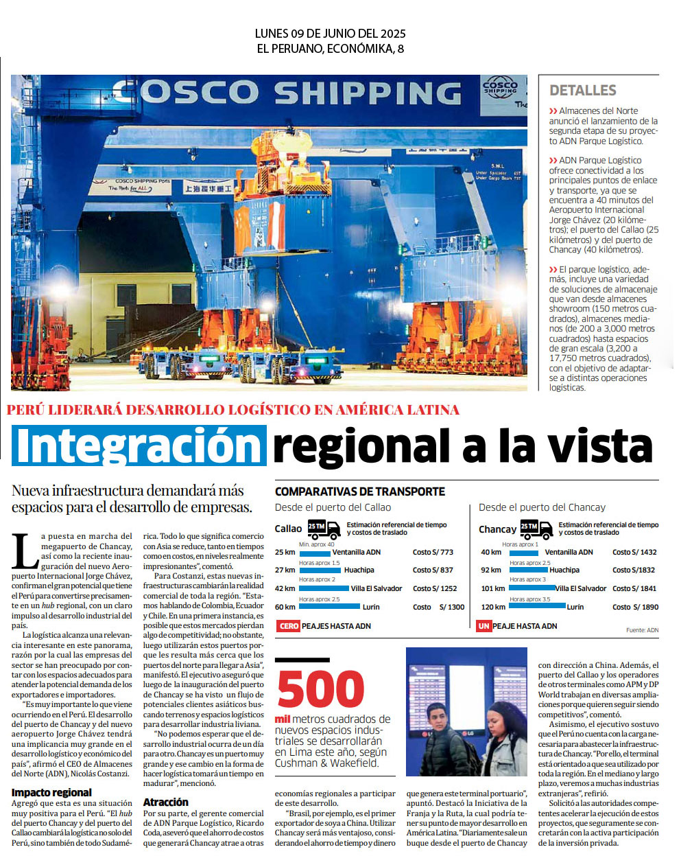La puesta en marcha del megapuerto de Chancay, así como la reciente inauguración del nuevo Aeropuerto Internacional Jorge Chávez, confirman el gran potencial que tiene el Perú para convertirse precisamente en un hub regional, con un claro impulso al desarrollo industrial del país. “Es muy importante lo que viene ocurriendo en el Perú. El desarrollo del puerto de Chancay y del nuevo aeropuerto Jorge Chávez tendrá una implicancia muy grande en el desarrollo logístico y económico del país”, afirmó el CEO de Almacenes del Norte (ADN), Nicolás Costanzi. Agregó que esta es una situación muy positiva para el Perú. “El hub del puerto Chancay y del puerto del Callao cambiará la logística no solo de rica. Todo lo que significa comercio con Asia se reduce, tanto en tiempos como en costos, en niveles realmente impresionantes”, comentó.