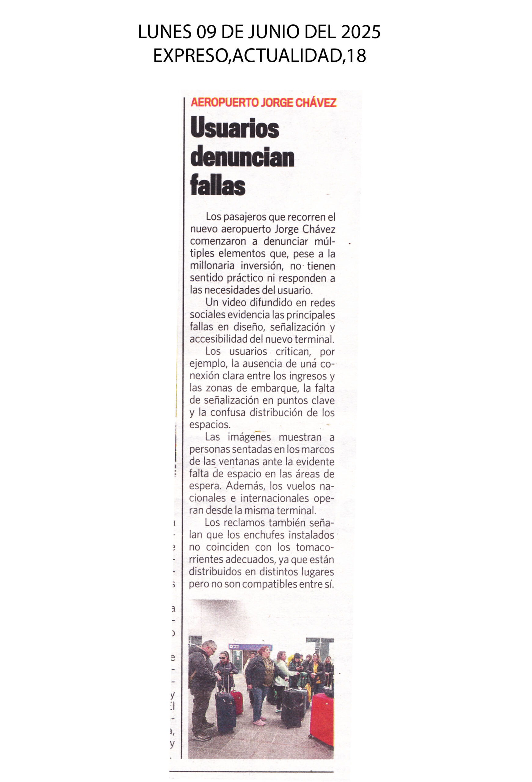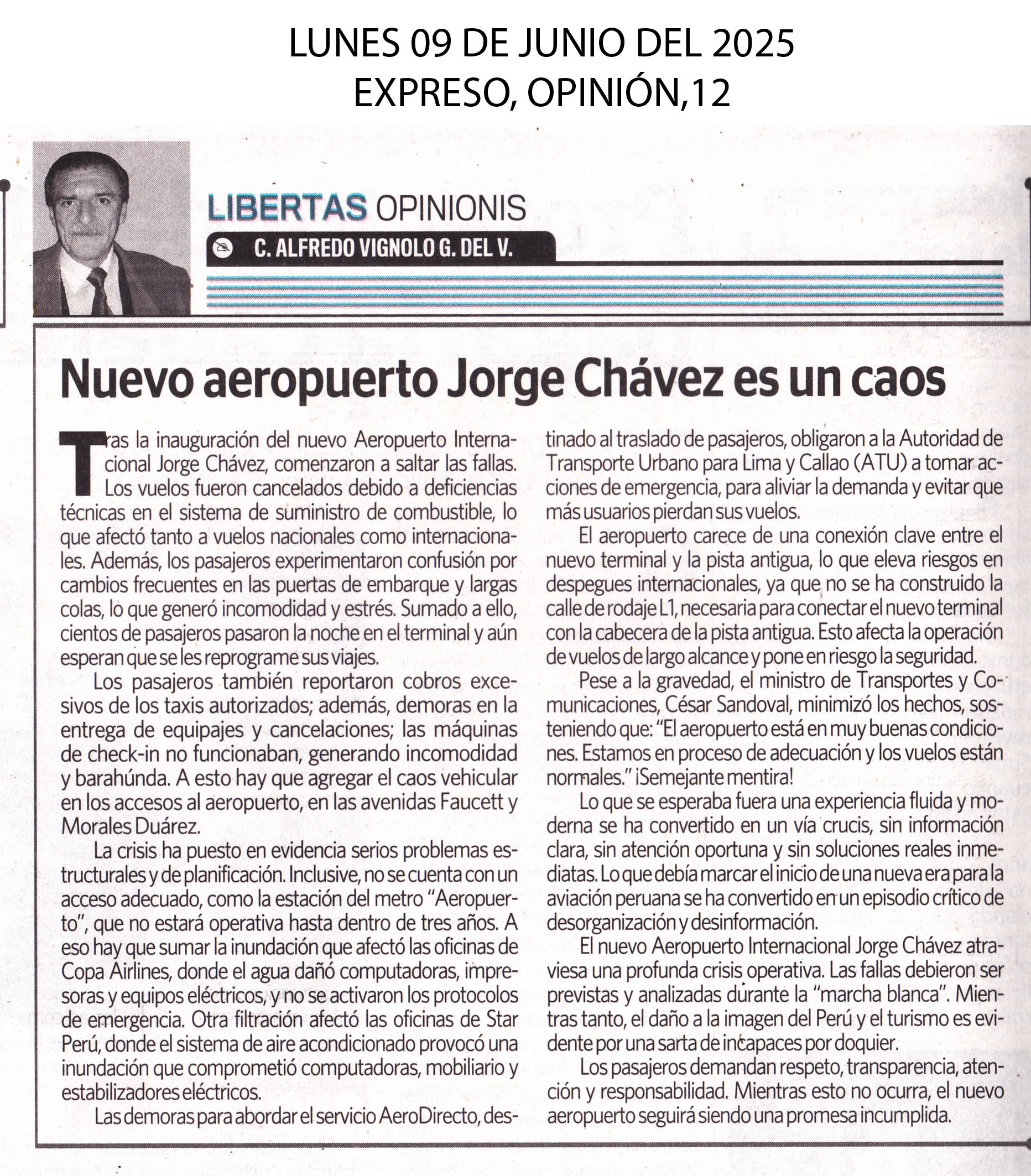 Artículo de Alfredo Vignolo. “Tras la inauguración del nuevo Aeropuerto Internacional Jorge Chávez, comenzaron a saltar las fallas. Los vuelos fueron cancelados debido a deficiencias técnicas en el sistema de suministro de combustible, lo que afectó tanto a vuelos nacionales como internacionales. Además, los pasajeros experimentaron confusión por cambios frecuentes en las puertas de embarque y largas colas, lo que generó incomodidad y estrés. Sumado a ello, cientos de pasajeros pasaron la noche en el terminal y aún esperan que se les reprograme sus viajes (...) El nuevo Aeropuerto Internacional Jorge Chávez atraviesa una profunda crisis operativa. Las fallas debieron ser previstas y analizadas durante la “marcha blanca”. Mientras tanto, el daño a la imagen del Perú y el turismo es evidente por una sarta de incapaces por doquier..."