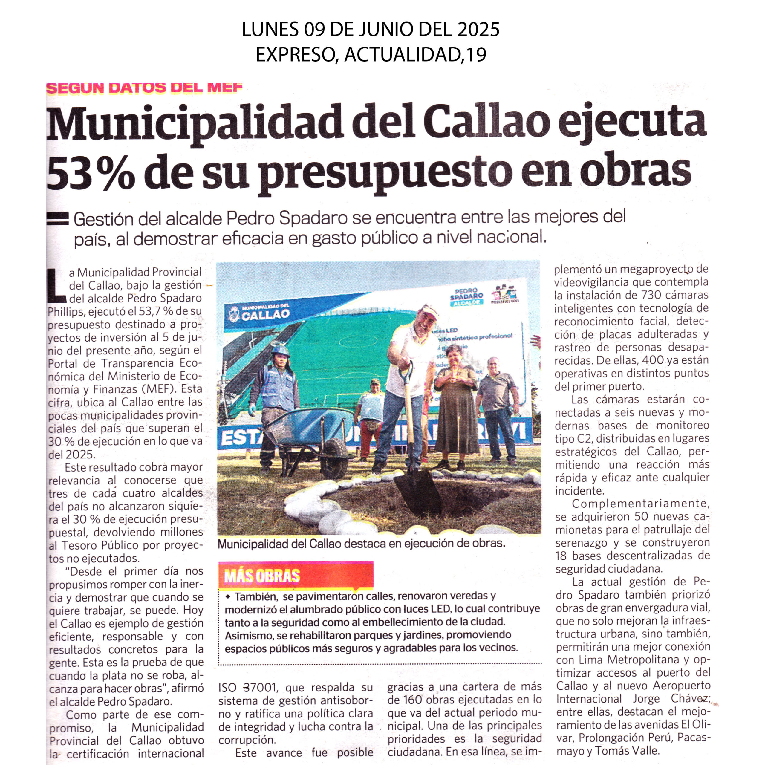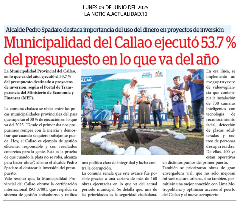 La Municipalidad Provincial del Callao, bajo la gestión del alcalde Pedro Spadaro Phillips, ejecutó el 53,7 % de su presupuesto destinado a proyectos de inversión al 5 de junio del presente año, según el Portal de Transparencia Económica del Ministerio de Economía y Finanzas (MEF). Esta cifra, publicada por el diario El Comercio, ubica al Callao entre las pocas municipalidades provinciales del país que superan el 30 % de ejecución en lo que va del 2025. Este resultado cobra mayor relevancia al conocerse que tres de cada cuatro alcaldes del país no han alcanzado ni siquiera el 30 % de ejecución presupuestal, devolviendo millones al Tesoro Público por proyectos no ejecutados.