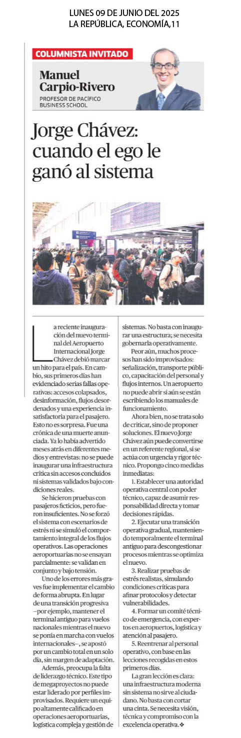 Artículo de Manuel Carpio-Rivero (Profesor de Pacifico School). “La reciente inauguración del nuevo terminal del Aeropuerto Internacional Jorge Chávez debió marcar un hito para el país. En cambio, sus primeros días han evidenciado serias fallas operativas: acceso colapsados, desinformación, flujos desordenados y una experiencia insatifactoria para el pasajero. Esto no es una sorprensa, Fue una crónica de una muerte anunciada…”.