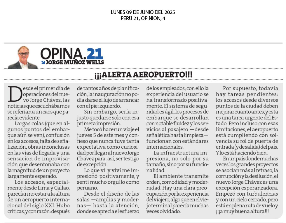 Artículo de Jorge Muñoz Wells. "Desde el primer día de operaciones del nuevo Jorge Chávez, las noticias que escuchábamos se referían a un caos que parecía evidente (…) Los accesos, especialmente desde Lima y Callao, parecían no estar a la altura de un aeropuerto internacional del siglo XXI. Hubo críticas, y con razón: después de tantos años de planificación, la inauguración no podía darse el lujo de arrancar con el pie izquierdo. Sin embargo, sería injusto quedarse solo con esa primera impresión. Me tocó hacer un viaje el jueves 5 de este mes y confieso que nunca tuve tanta expectativa como curiosidad por llegar al nuevo Jorge Chávez para, así, ser testigo de excepción. Lo que vi y viví me impresionó positivamente, y sentí mucho orgullo como peruano (…) La infraestructura impresiona, no solo por su tamaño, sino por su funcionalidad...".