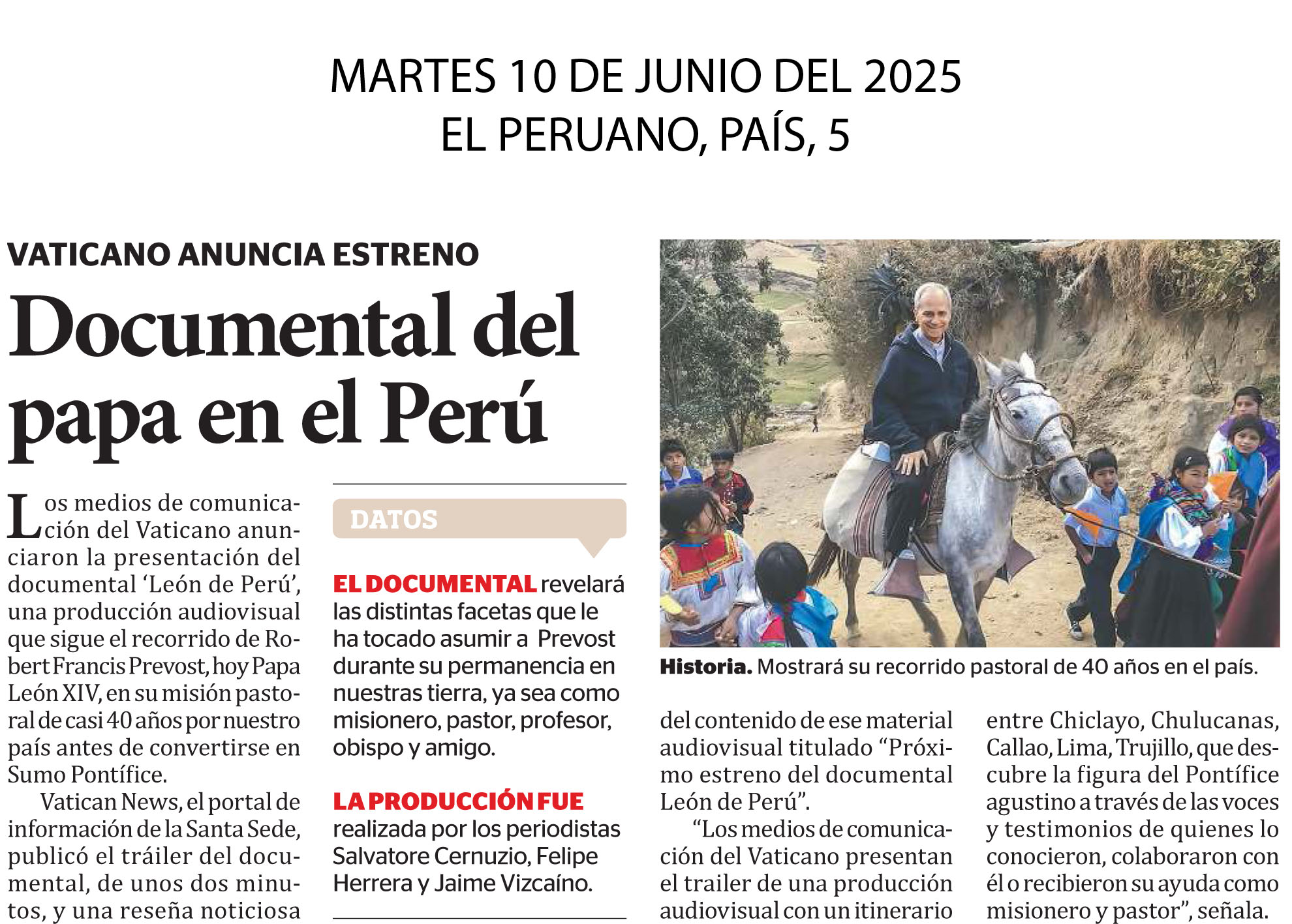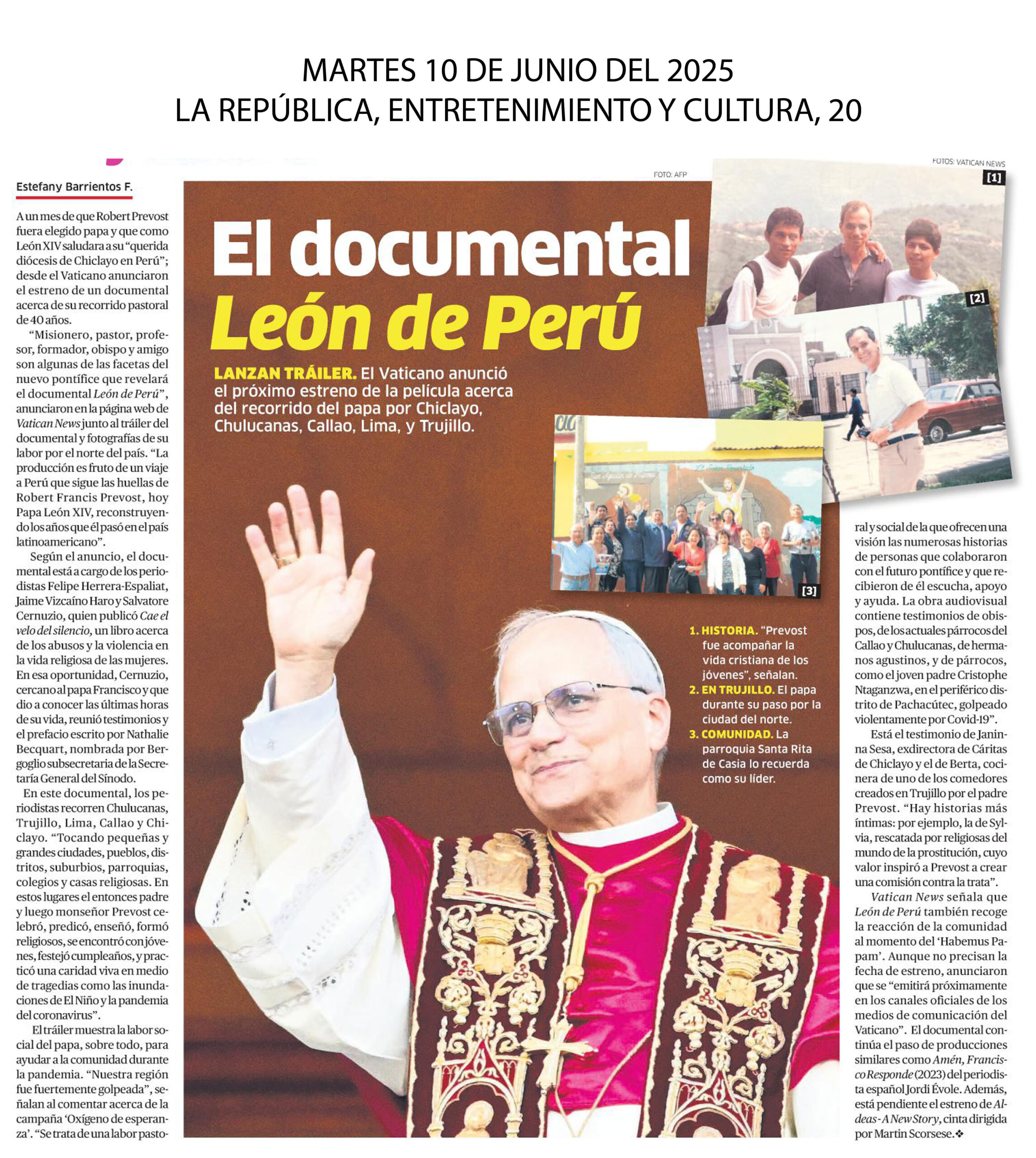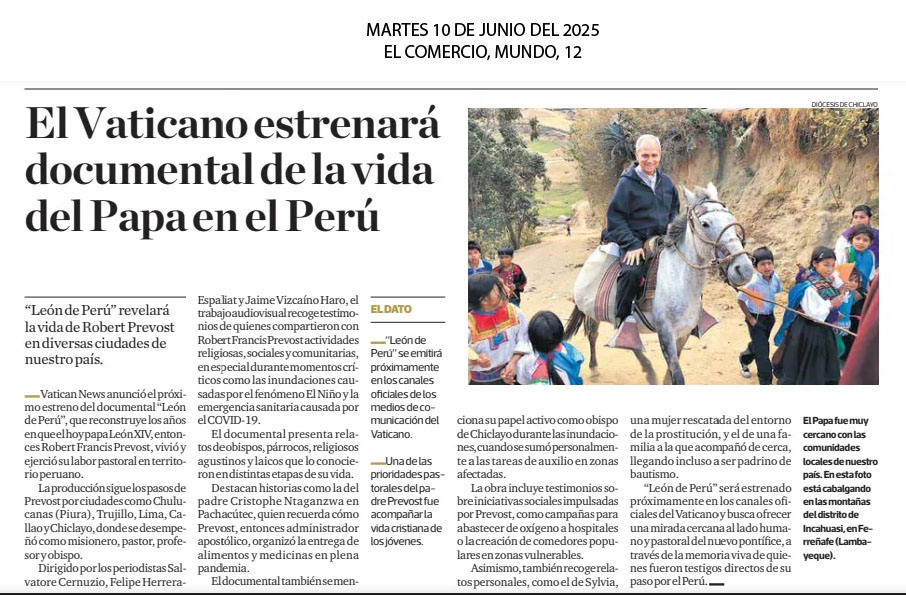Los medios de comunicación del Vaticano anunciaron la presentación del documental ‘León de Perú’, una producción audiovisual que sigue el recorrido de Robert Francis Prevost, hoy Papa León XIV, en su misión pastoral de casi 40 años por nuestro país antes de convertirse en Sumo Pontífice.“Los medios de comunicación del Vaticano presentan el trailer de una producción audiovisual con un itinerario entre Chiclayo, Chulucanas, Callao, Lima, Trujillo, que descubre la figura del Pontífice agustino a través de las voces y testimonios de quienes lo conocieron, colaboraron con él o recibieron su ayuda como misionero y pastor”, señala.