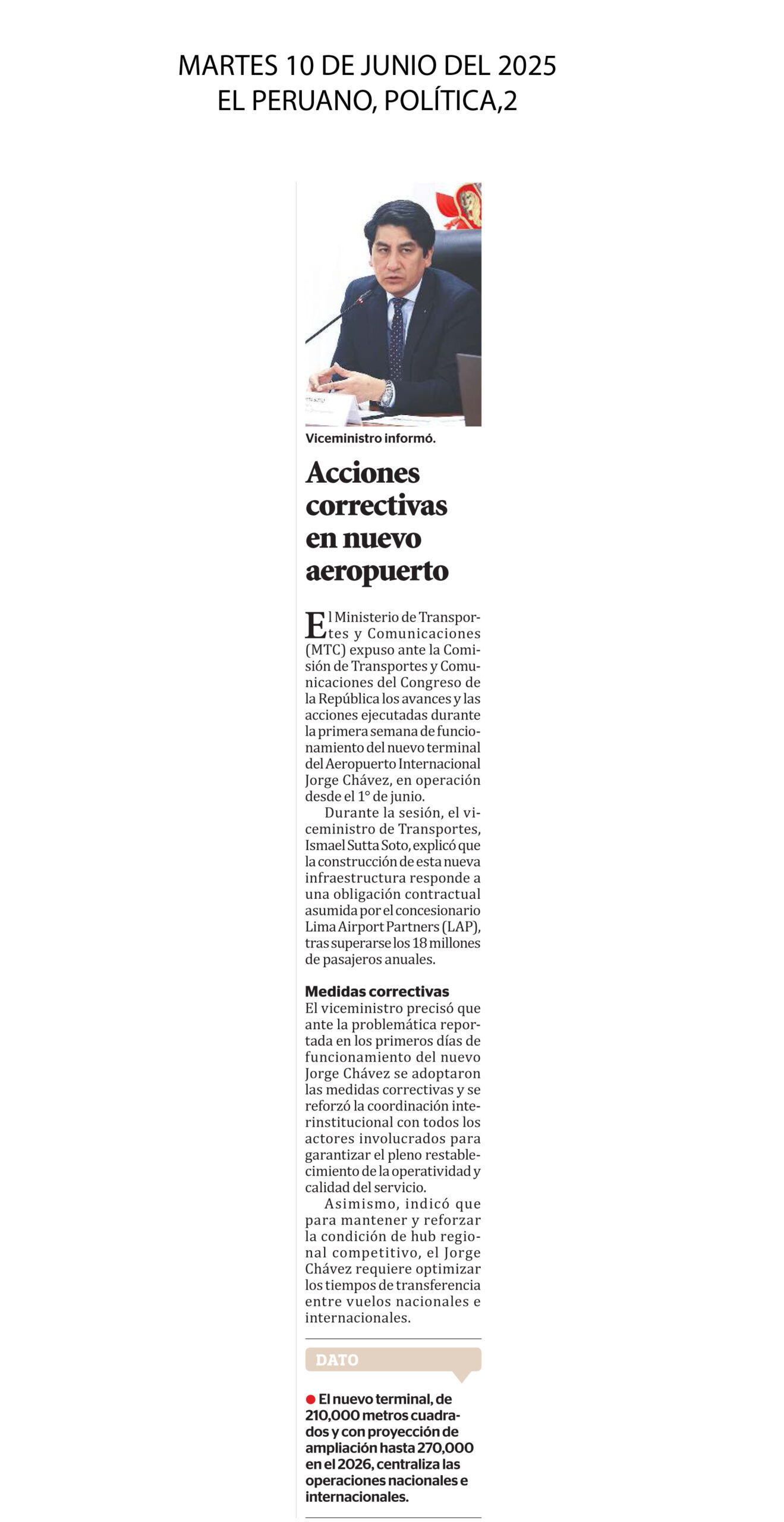 El Ministerio de Transportes y Comunicaciones (MTC) expuso ante la Comisión de Transportes y Comunicaciones del Congreso de la República los avances y las acciones ejecutadas durante la primera semana de funcionamiento del nuevo terminal del Aeropuerto Internacional Jorge Chávez, en operación desde el 1° de junio. Durante la sesión, el viceministro de Transportes, Ismael Sutta Soto, explicó que la construcción de esta nueva infraestructura responde a una obligación contractual asumida por el concesionario Lima Airport Partners (LAP), tras superarse los 18 millones de pasajeros anuales.