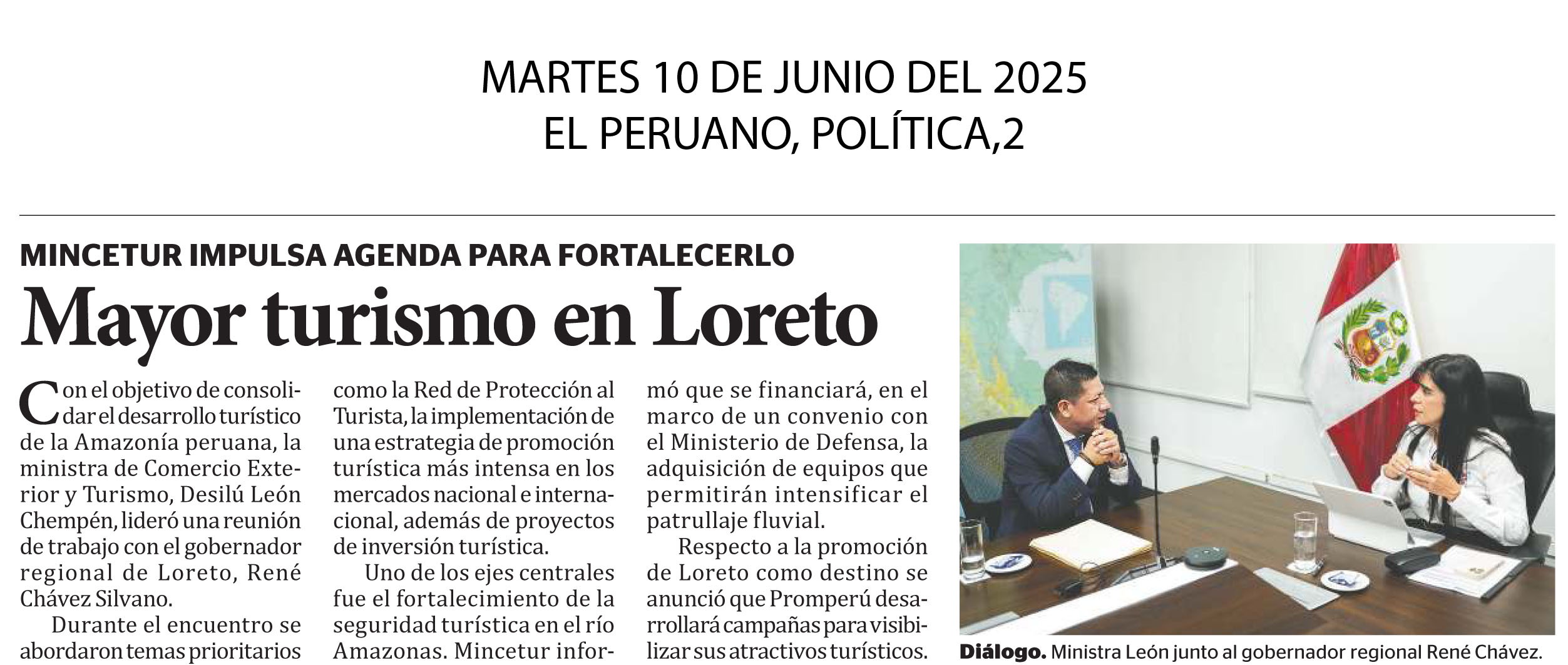 Con el objetivo de consolidar el desarrollo turístico de la Amazonía peruana, la ministra de Comercio Exterior y Turismo, Desilú León Chempén, lideró una reunión de trabajo con el gobernador regional de Loreto, René Chávez Silvano. Durante el encuentro se abordaron temas prioritarios como la Red de Protección al Turista, la implementación de una estrategia de promoción turística más intensa en los mercados nacional e internacional, además de proyectos de inversión turística.