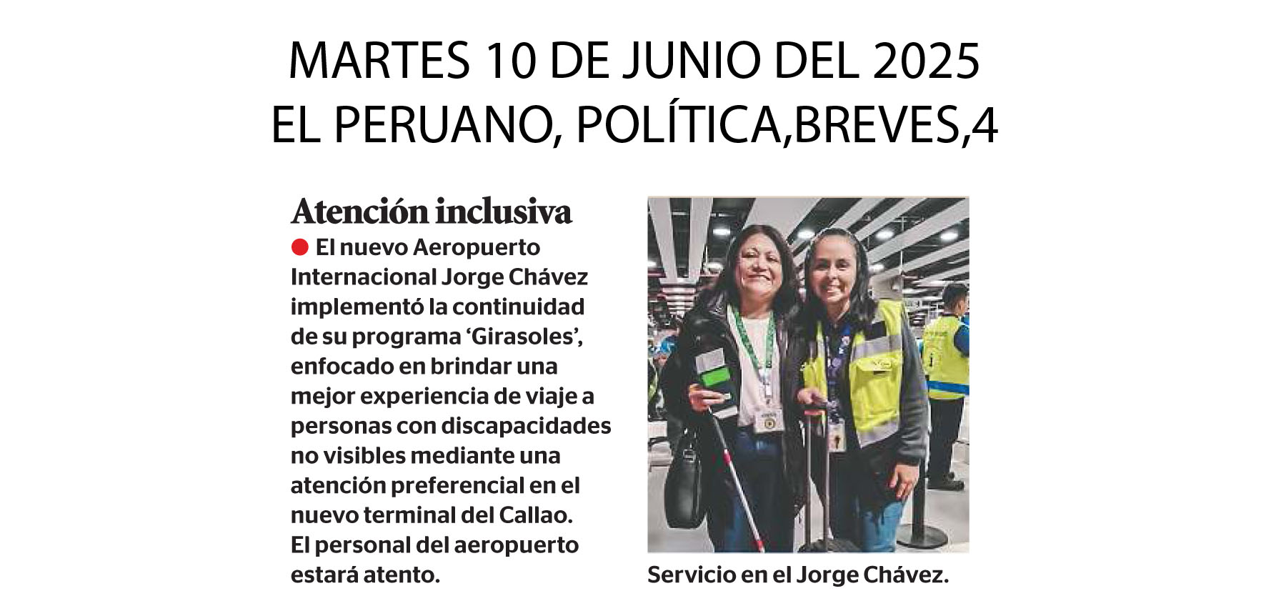 El nuevo Aeropuerto Internacional Jorge Chávez implementó la continuidad de su programa ‘Girasoles’, enfocado en brindar una mejor experiencia de viaje a personas con discapacidades no visibles mediante una atención preferencial en el nuevo terminal del Callao. El personal del aeropuerto estará atento.