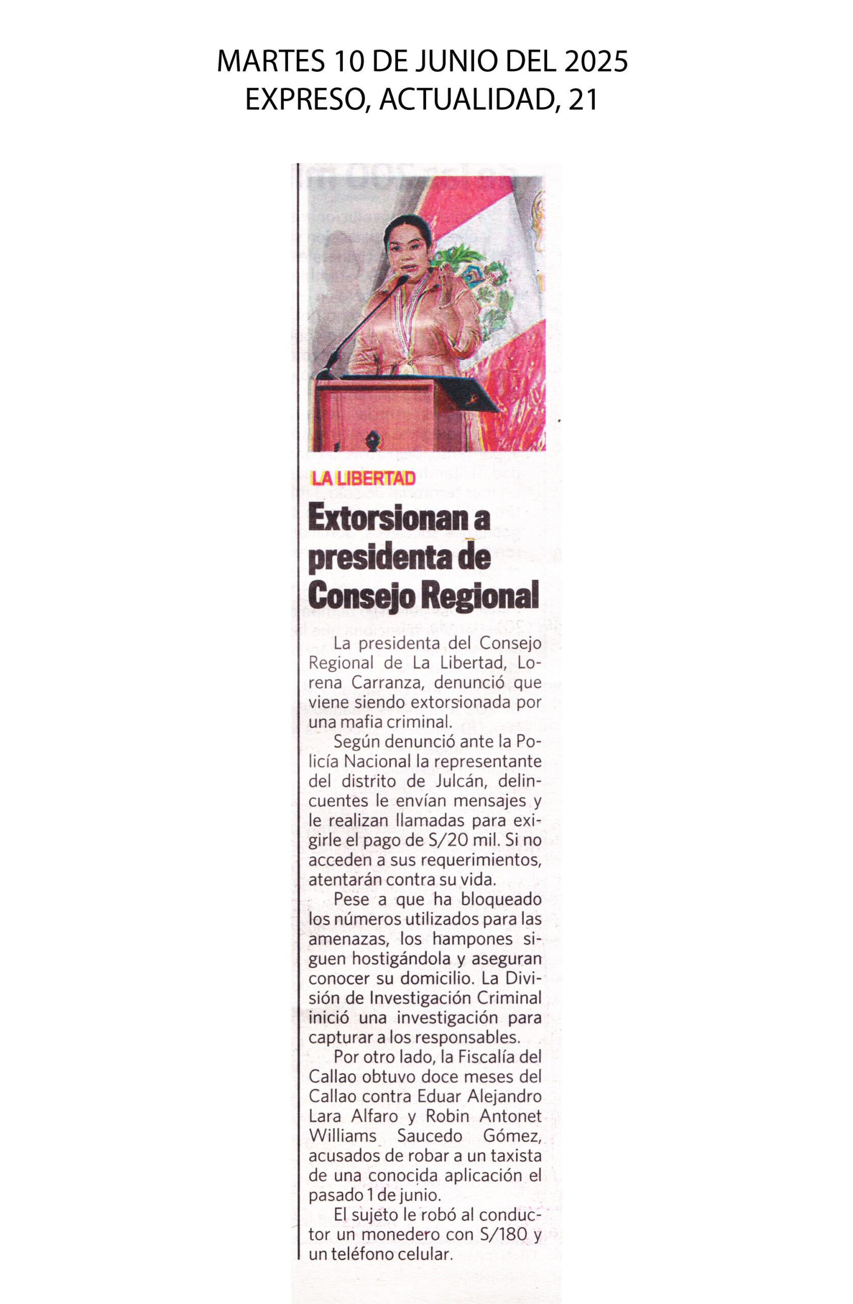 La presidenta del Consejo Regional de La Libertad, Lorena Carranza, denunció que viene siendo extorsionada por una mafia criminal. Según denunció ante la Policía Nacional la representante del distrito de Julcán, delincuentes le encían mensajes y le realizan llamadas para exigirle el pago de S/ 20 mil. Si no accedern a sus requerimientos, atentarán contra su vida.