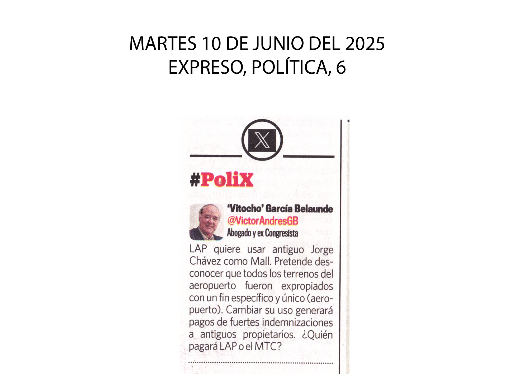 El excongresista Victor García Belaunde comentó en su cuenta X que LAP quiere usar el antiguo Jorge Chávez como Mall. “Pretende desconocer que todos los terrenos del aeropuerto fueron expropiados con un fin específico y único (aeropuerto). Cambiar su uso generará pagos de Fuertes indemnizaciones…”.