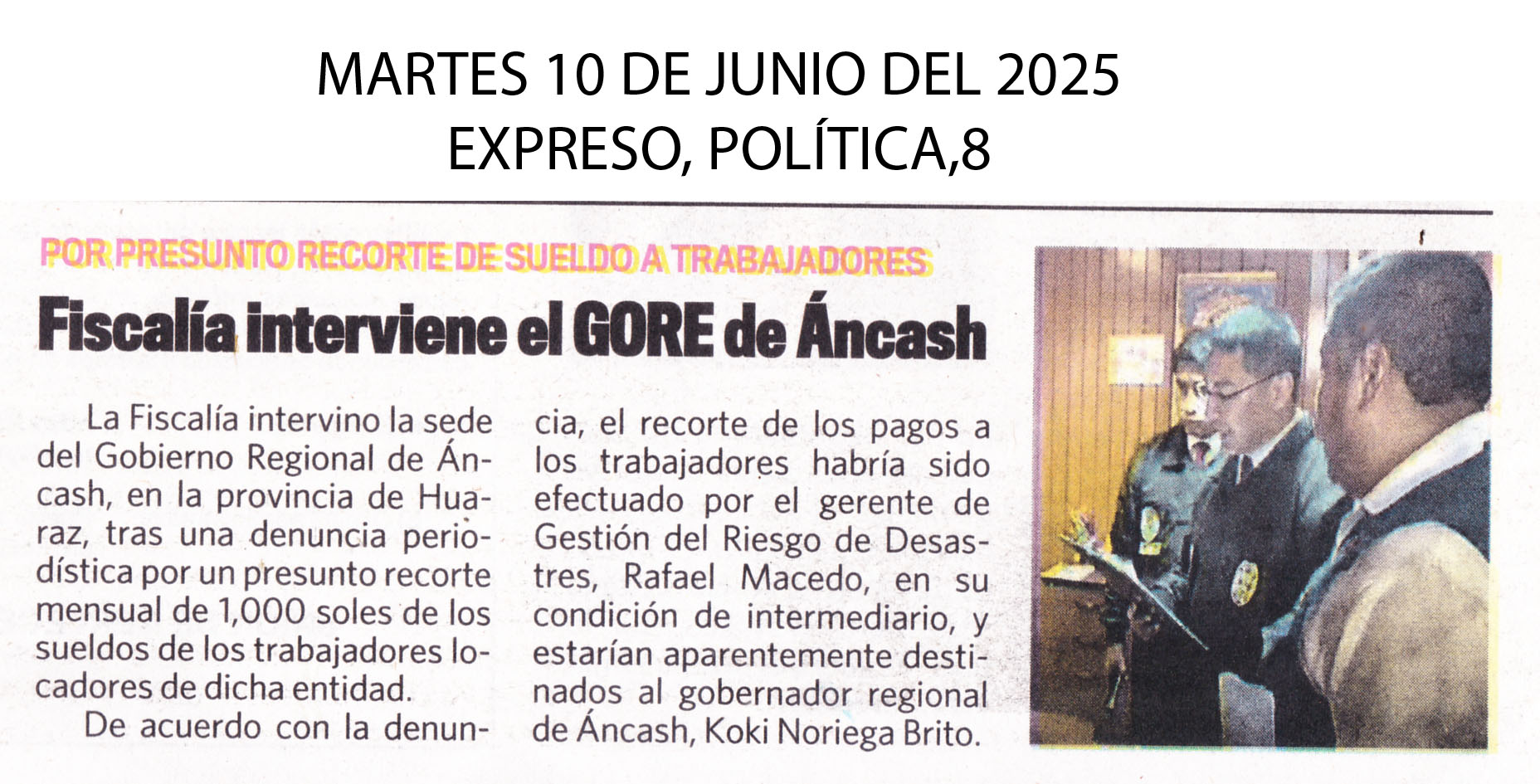 La Fiscalía intervino la sede del Gobierno Regional de Áncash, en la provincial de Huaraz, tras una denuncia periodística por un presunto recorte mensual de 1,000 soles de los sueldos de los trabajadores locadores de dicha entidad.