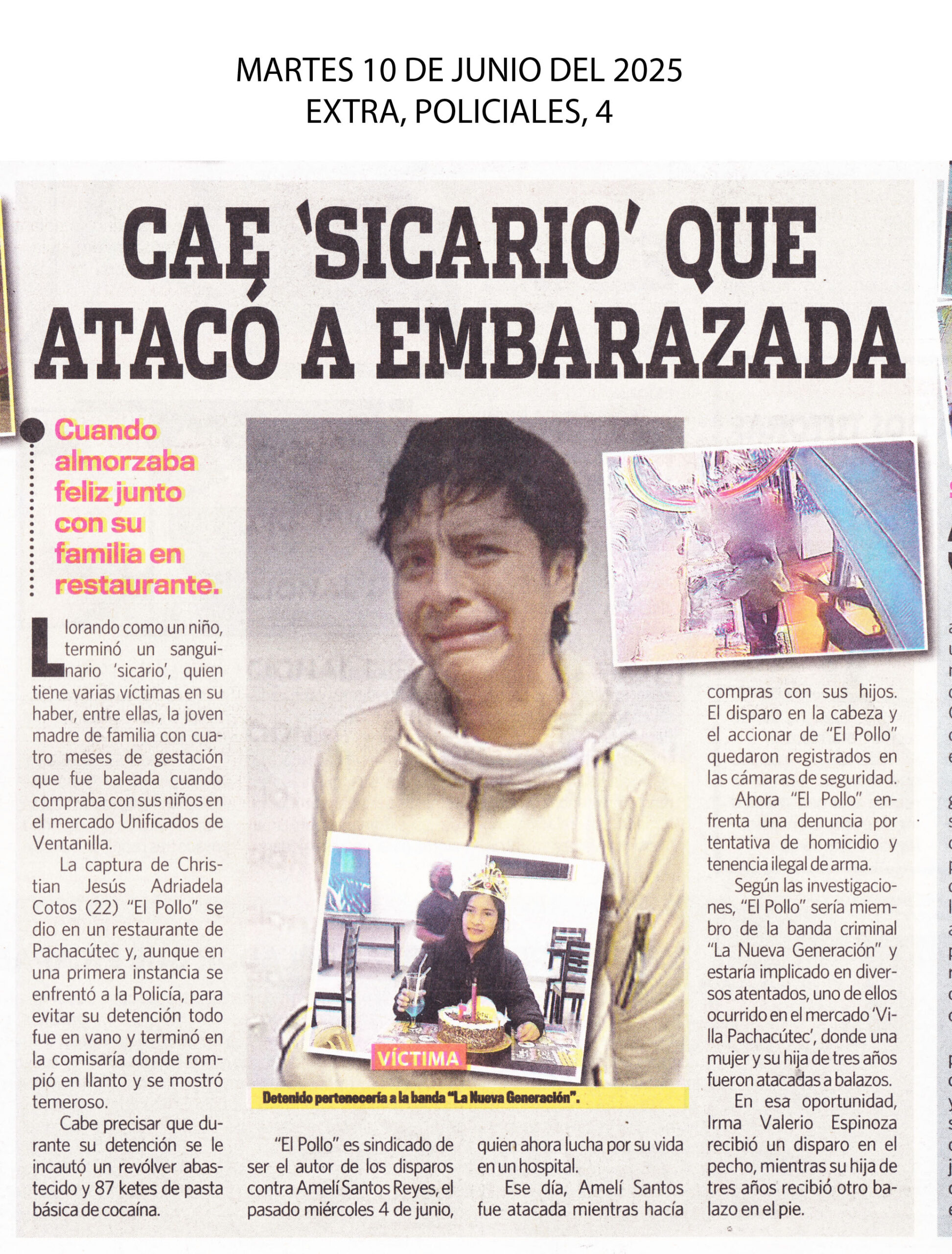 Christian Jesús Adriadela Cotos, alias “El Pollo”, fue capturado por agentes de la Policía Nacional tras un operativo realizado en la zona de Pachacútec, en Ventanilla. El joven, de 22 años, es sindicado como el presunto autor del ataque a balazos contra una mujer embarazada en el interior del mercado Unificados. La víctima, quien recibió un tiro a quemarropa, fue trasladada de emergencia a un centro de salud donde lucha por su vida junto a su bebé.