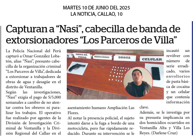 La Policía Nacional del Perú capturó a Omar González Lobatón, alias “Ñasi”, presunto cabecilla de la organización criminal “Los Parceros de Villa”, dedicada a extorsionar a trabajadores de obras de agua y desagüe en el distrito de Ventanilla. Según las investigaciones, “Ñasi” exigía el pago de S/5,000 semanales a cambio de no atentar contra los obreros ni paralizar los trabajos. El operativo fue realizado por agentes de la División de Investigación Criminal de Ventanilla y la División Regional del Callao en el asentamiento humano Ampliación Las Flores.