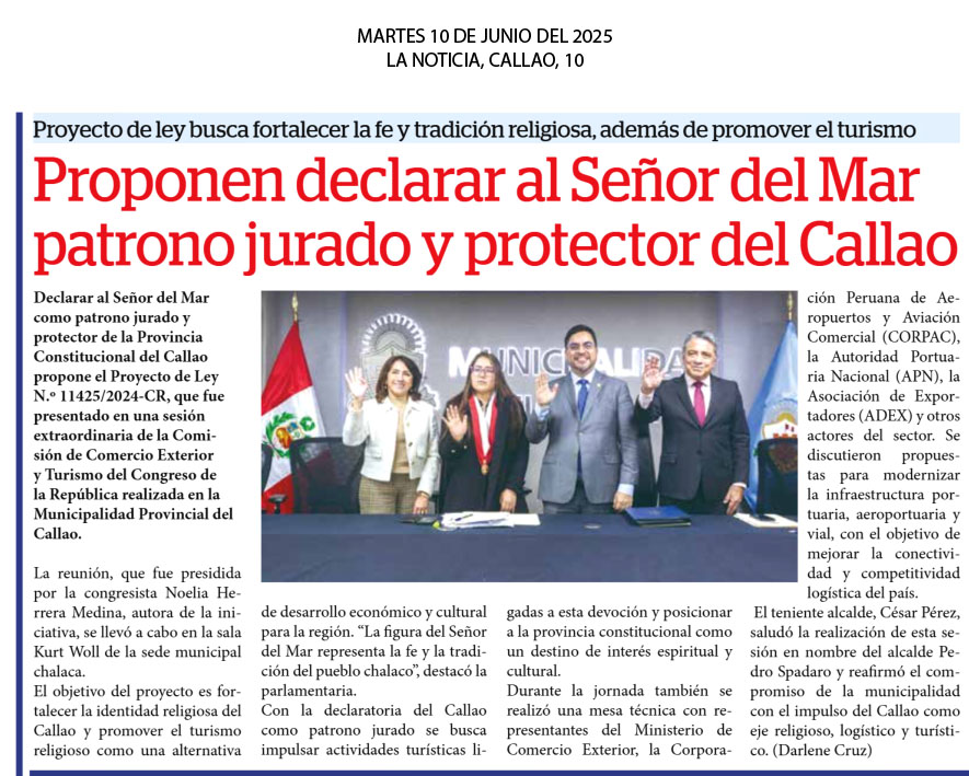 Declarar al Señor del Mar como patrono jurado y protector de la Provincia Constitucional del Callao propone el Proyecto de Ley N.º 11425/2024-CR, que fue presentado en una sesión extraordinaria de la Comisión de Comercio Exterior y Turismo del Congreso de la República realizada en la Municipalidad Provincial del Callao. La reunión, que fue presidida por la congresista Noelia Herrera Medina, autora de la iniciativa, se llevó a cabo en la sala Kurt Woll de la sede municipal chalaca. El objetivo del proyecto es fortalecer la identidad religiosa del Callao y promover el turismo religioso como una alternativa de desarrollo económico y cultural para la región. “La figura del Señor del Mar representa la fe y la tradición del pueblo chalaco”, destacó la parlamentaria.