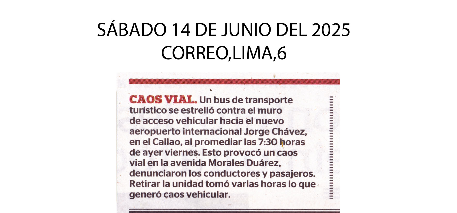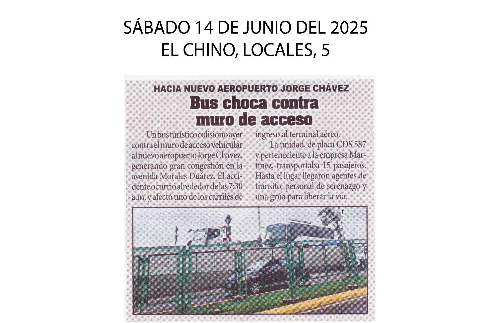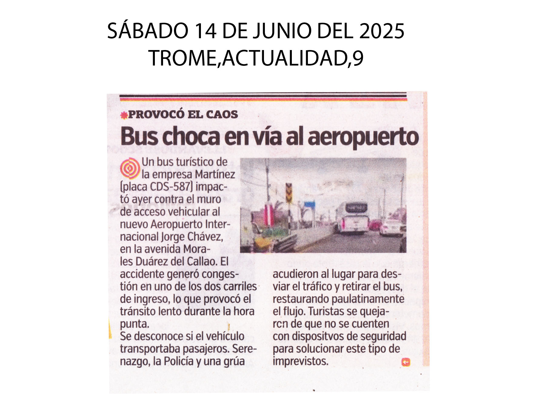 Un bus turístico de la empresa Martínez (placa CDS-587) impactó ayer contra el muro de acceso vehicular al nuevo Aeropuerto Jorge Chávez en la avenida Morales Duárez del Callao. El accidente generó congestion en uno de los dos carriles de ingreso, lo que provocó el tránsito lento durante la hora punta. Se desconoce si el vehículo transportaba pasajeros.