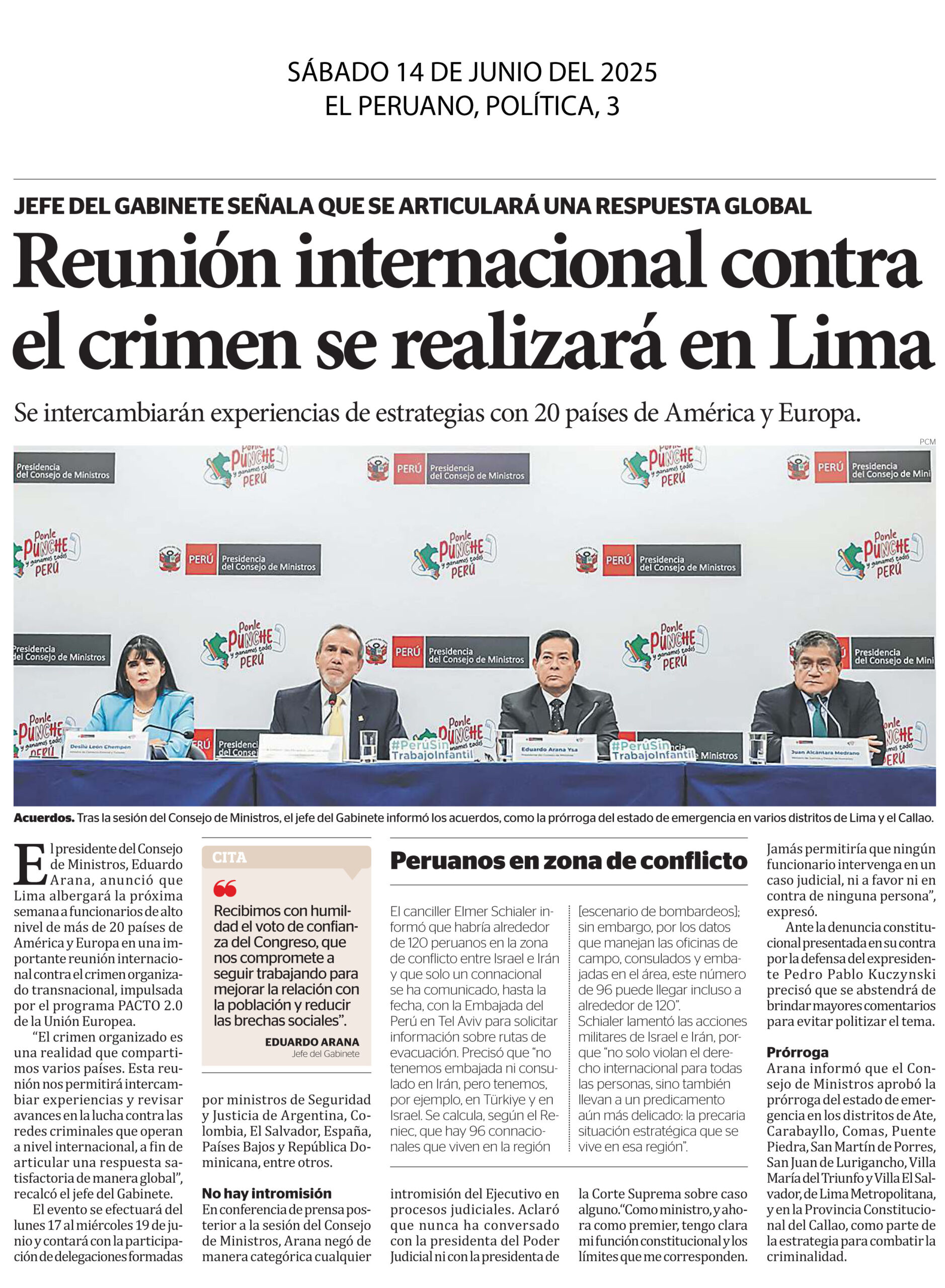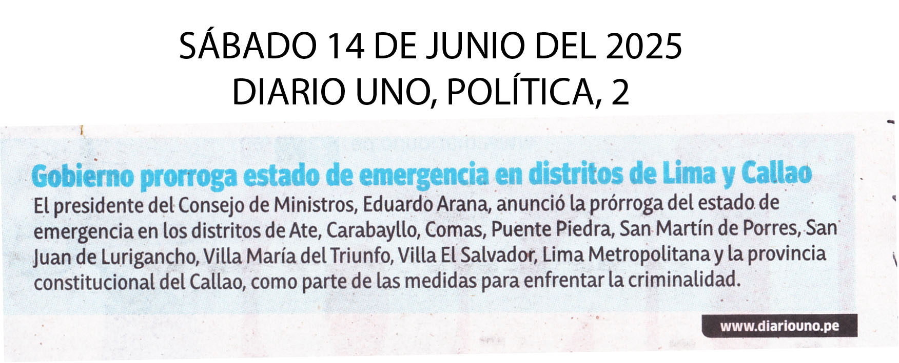 El presidente del Consejo de Ministros, Eduardo Arana, anunció la prórroga del estado de emergencia en los distritos de Ate, Carbayllo, Comas, Puente Piedra, San Martín de Porres, San Juan de Lurigancho, Villa María del Triunfo, Villa El Salvador, Lima Metropolitana y la provincial constitucional del Callao, como parte de las medidas para enfrentar la criminalidad.