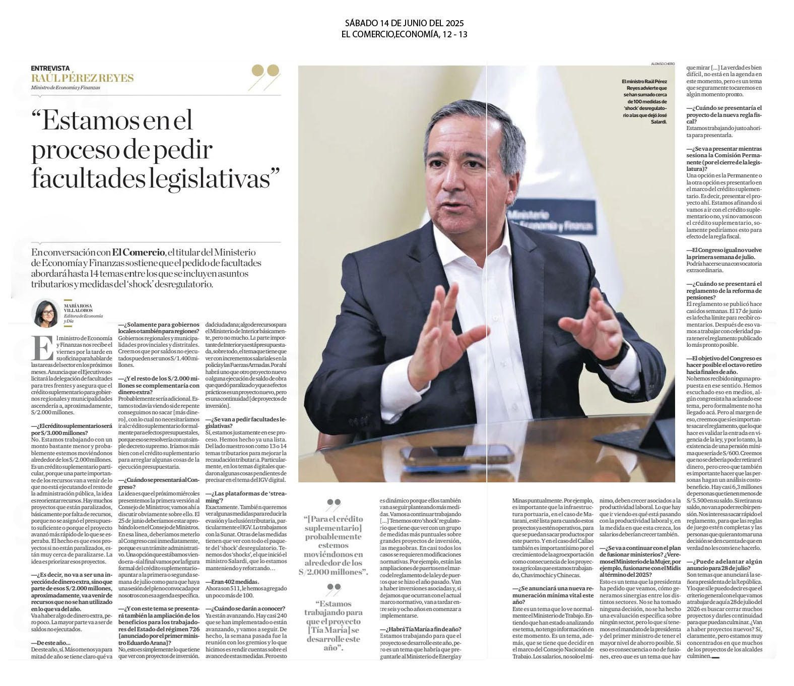 En conversación con El Comercio, el titular del Ministerio de Economía y Finanzas, Raúl Pérez Reyes sostiene que el Ejecutivo solicitará la delegación de facultades para tres frentes y asegura que el crédito suplementario para gobiernos regionales y municipalidades ascendería a, aproximadamente, S/ 2,000 millones. Durante la entrevista destacó la importancia de la infraestructura portuaria, como las de Matarani y el Callao para la exportación de productos. “(…) Y en el caso del Callao también es importantísimo por el crecimiento de la agroexportación como consecuencia de los proyectos agrícolar que estamos trabajando, Chavimochic y Chinecas”, declaró.