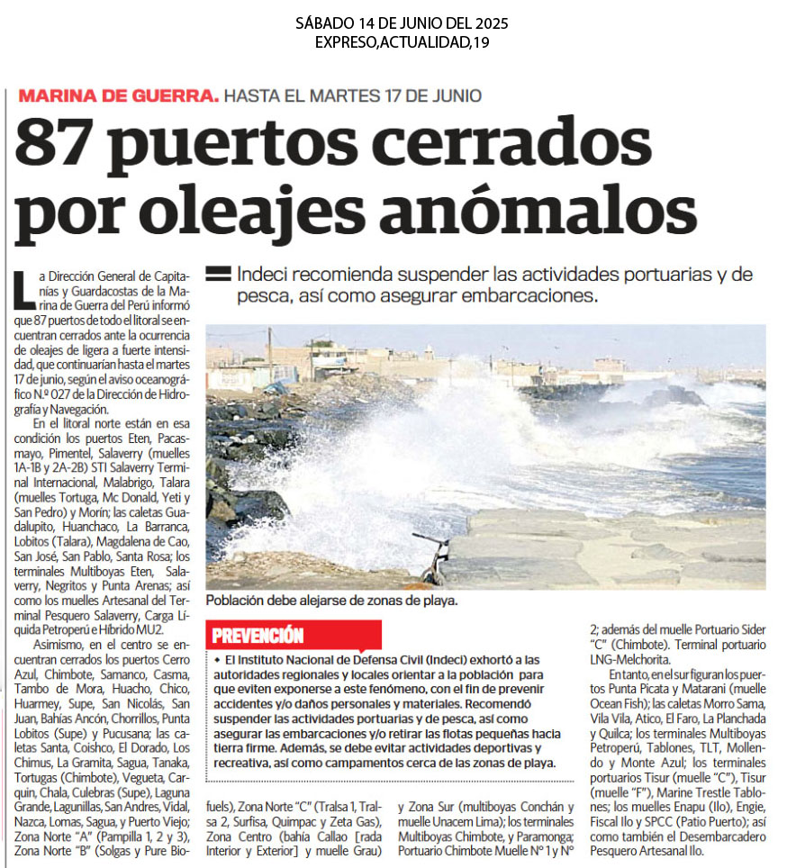 La Dirección General de Capitanías y Guardacostas (Dicapi) de la Marina de Guerra del Perú informó este viernes que 87 puertos a lo largo del litoral peruano han sido cerrados temporalmente debido a la presencia de oleajes anómalos de ligera a fuerte intensidad, según lo indica el aviso oceanográfico Nro, 027 emitido por la Dirección de Hidrografía y Navegación (Dihidronav). Este fenómeno marítimo, que afecta el normal desarrollo de actividades pesqueras, comerciales y recreativas, se prolongará hasta el martes 17 de junio. Entre los puertos que permaneceran cerrados se encuentra en la Zona Centro (bahía del Callao y muelle Grau).