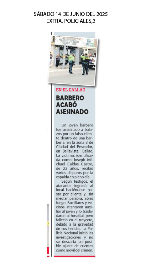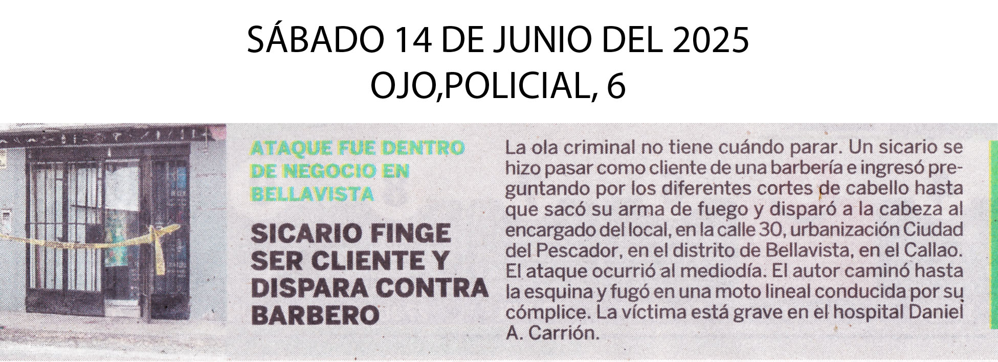 Un sicario se hizo pasar como cliente de una barbería e ingresó preguntando por los diferentes cortes de cabello, hasta que sacó su arma de fuego y disparó en la cabeza al encargado del local, en la calle 30, urbanización Ciudad del Pescador, Bellavisra, Callao. El ataque ocurrió al mediodía. El pistolero fugó en una moto lineal y la víctima está grave en el Hospital Daniel A. Carrión.