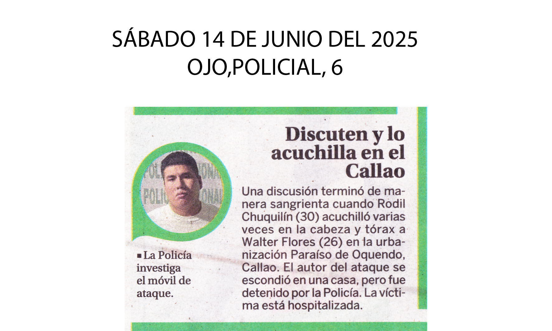Una discusión terminó de manera sangrienta cuando Rodil Chuquillín (30) acuchilló varias veces en la cabeza y el tórax a Walter Flores (26) en la urbanización Paraíso de Oquendo, en el Callao, tras el ataque, el agresos se escondió en una casa, pero al final fue detenido por la Policía Chalaca. La víctima está hospitalizada.