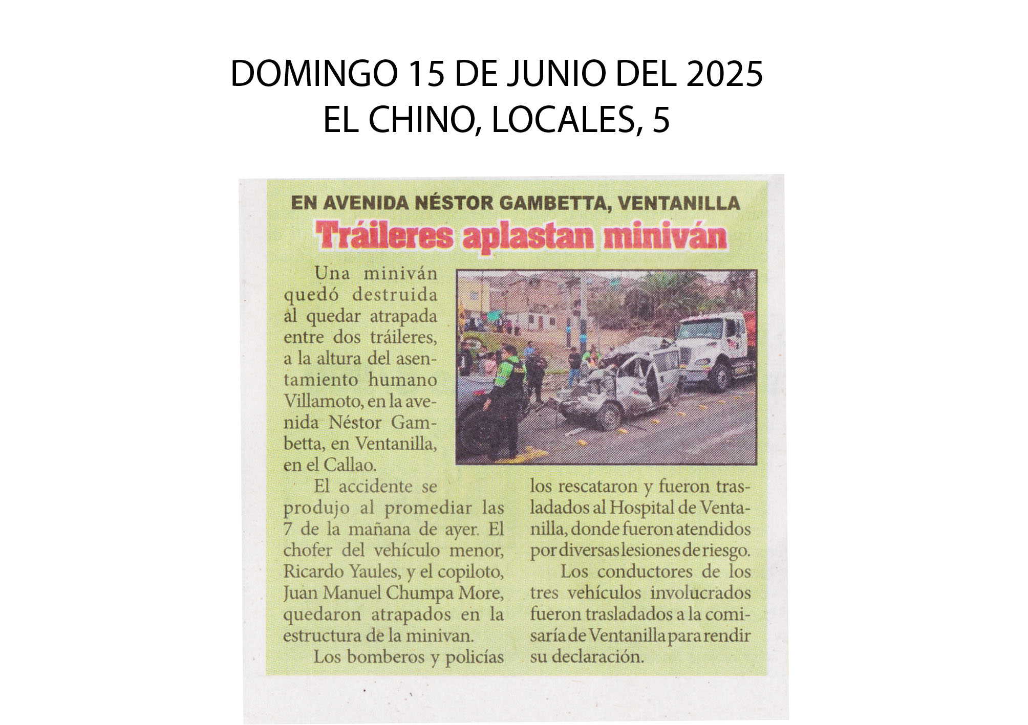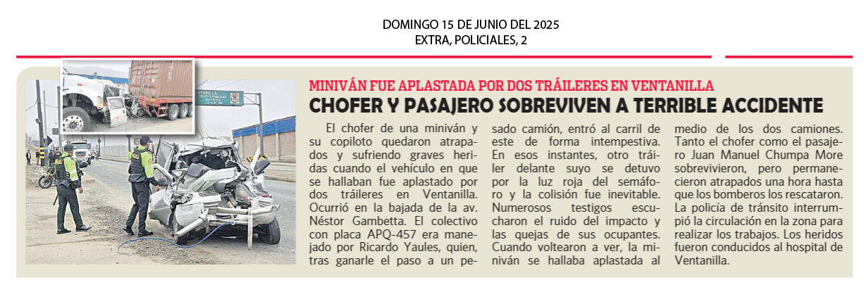 El chofer de una minivan y su copilot quedaron atrapados y sufriendo graves heridas cuando el vehículo en que se hallaban fue aplastado por dos trailers en Ventanilla. Ocurrió en la bajada de la av. Néstor Gambetta.