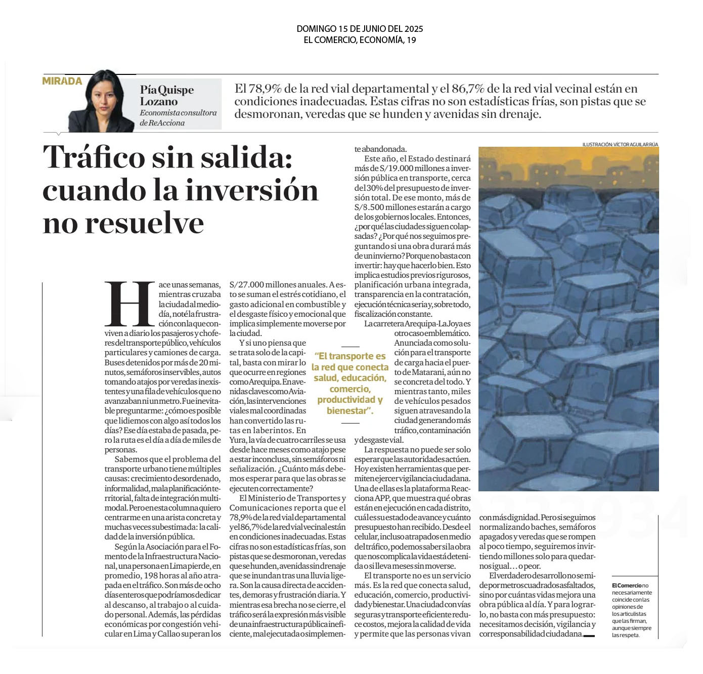 Artículo de Pía Quispe Lozano (Economista consultora de ReAcciona). “(…) Según la Asociación para el Fomento de la Infraestructura Nacional, una persona en Lima pierde, en promedio, 198 horas al año atrapada en el tráfico (…) Además, las pérdidas económicas por congestion vehicular en Lima y Callao superan los S/ 27.000 millones anuales…”.