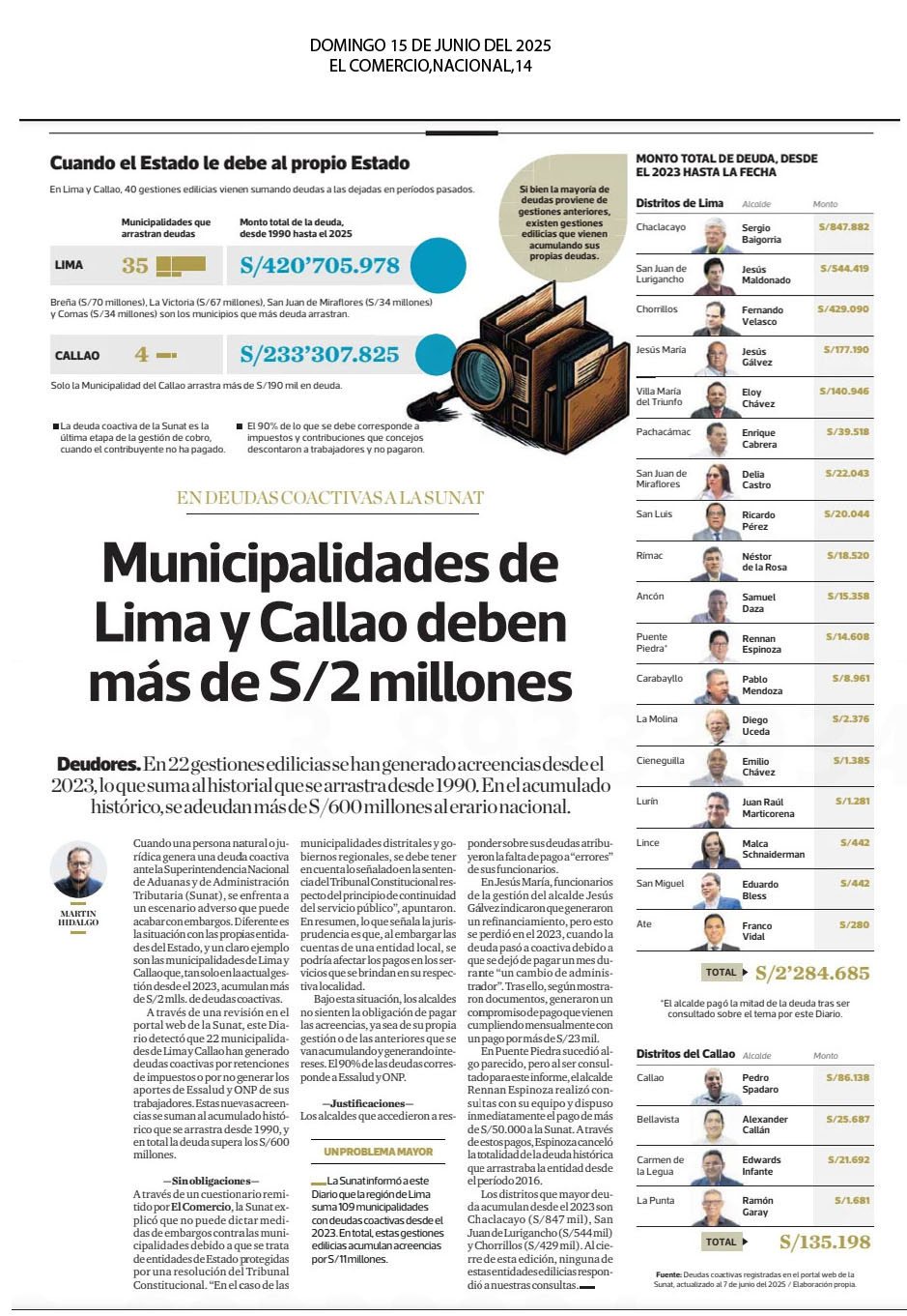 En 22 gestiones edilicias se han generado acreencias desde el 2023, lo que suma al historial que se arrastra desde 1990. En el acumulado histórico, se adeudan más de S/ 600 millones en el erario nacional.