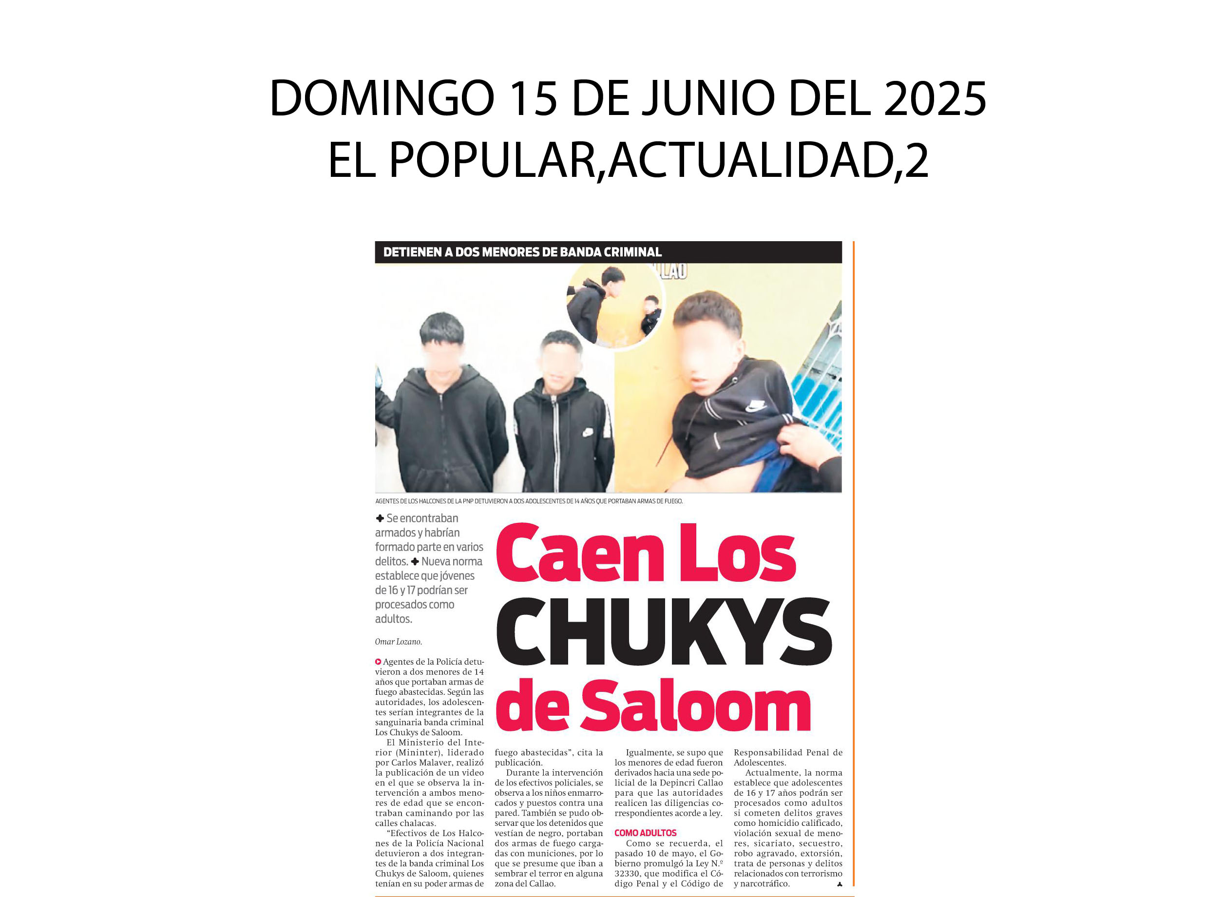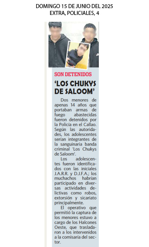 Dos menores de apenas 14 años que portaban armas de fuego abastecidas fueron detenidos por la Policía en el Callao. Según las autoridades, los adolescentes serían integrantes de la sanguinaria banda criminal “Los Chukys de Saloom”.